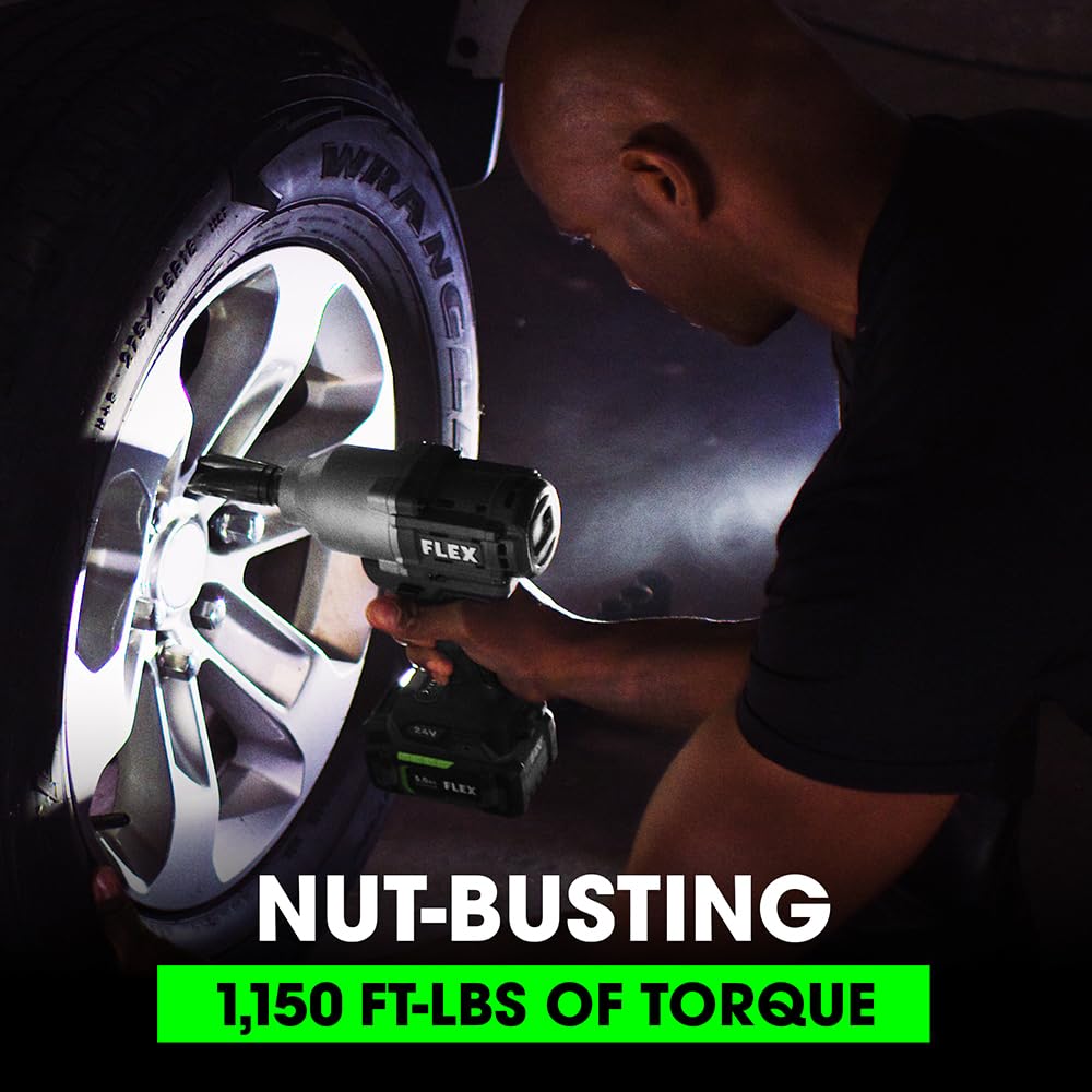 Details: When jobs demand nut-busting power, the FLEX 24V High Torque Impact Wrench delivers 1150 ft-lbs. of unrelenting torque. Take control with three adaptable speed modes and do it comfortably with vibration suppression. Activate Removal Mode for extra control to extract lug nuts quickly, safely, and efficiently. Built-in LED lighting illuminates your work area. This impact wrench dominates with the FLEX Advantage: unmatched battery power, runtime, and fast charging speed to keep you going. Protected by the FLEX Limited Lifetime Warranty when registered within 30 days of purchase at registermyFLEX.com through December 31, 2024.