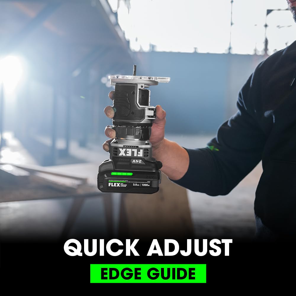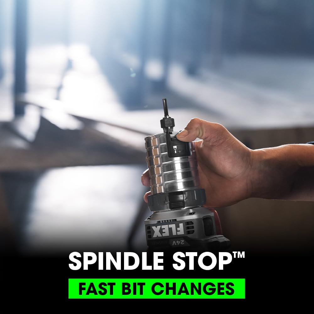 Details: Finish furniture and cabinetry or cut door and window holes from plywood and OSB with the FLEX 24V Trim Router. This 24V trim router tool features a patent-pending Spindle Stop™ shaft lock system for fast, easy bit changes and added safety by preventing accidental startups. Its powerful 1.5 max horsepower brushless motor delivers constant speed under the toughest conditions, and its variable speed dial offers six settings from 16,000 to 31,000 RPM. Quick-release collars deliver easy and reliable depth adjustment accurate to 1/64 inch. This trim router delivers the FLEX Advantage of unmatched battery power, runtime, and fast charging (battery and charger sold separately). It’s protected by the FLEX Limited Lifetime Warranty when registered within 30 days of purchase at registermyFLEX.com through December 31, 2024.