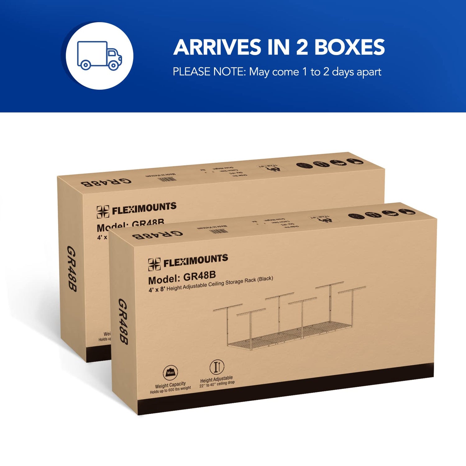 - IMPORTANT: Arrive in 2 boxes separately. Contact customer service for tracking information. 22" to 40"ceiling dropdown provides up to 105 cu.ft. of storage. Dimensions:96 in. L x 48 in. W x 22-40 in. H. (Hooks sold separately)