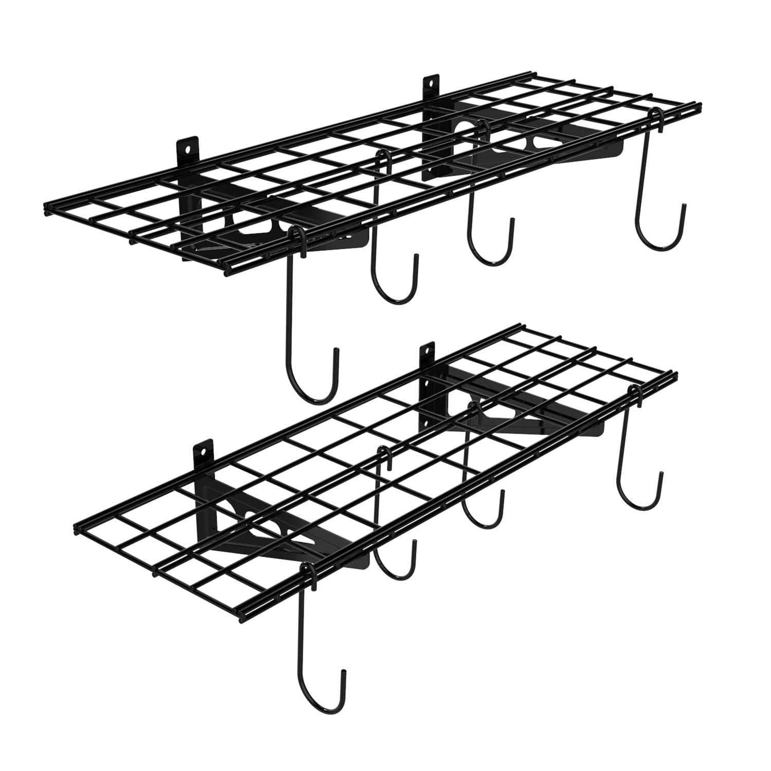 - HEAVY-GAUGE STEEL CONSTRUCTION: With a steel wire grid and steel hooks, garage storage shelving holds up to 300 lbs total, with each hook holding up to 55 lbs.