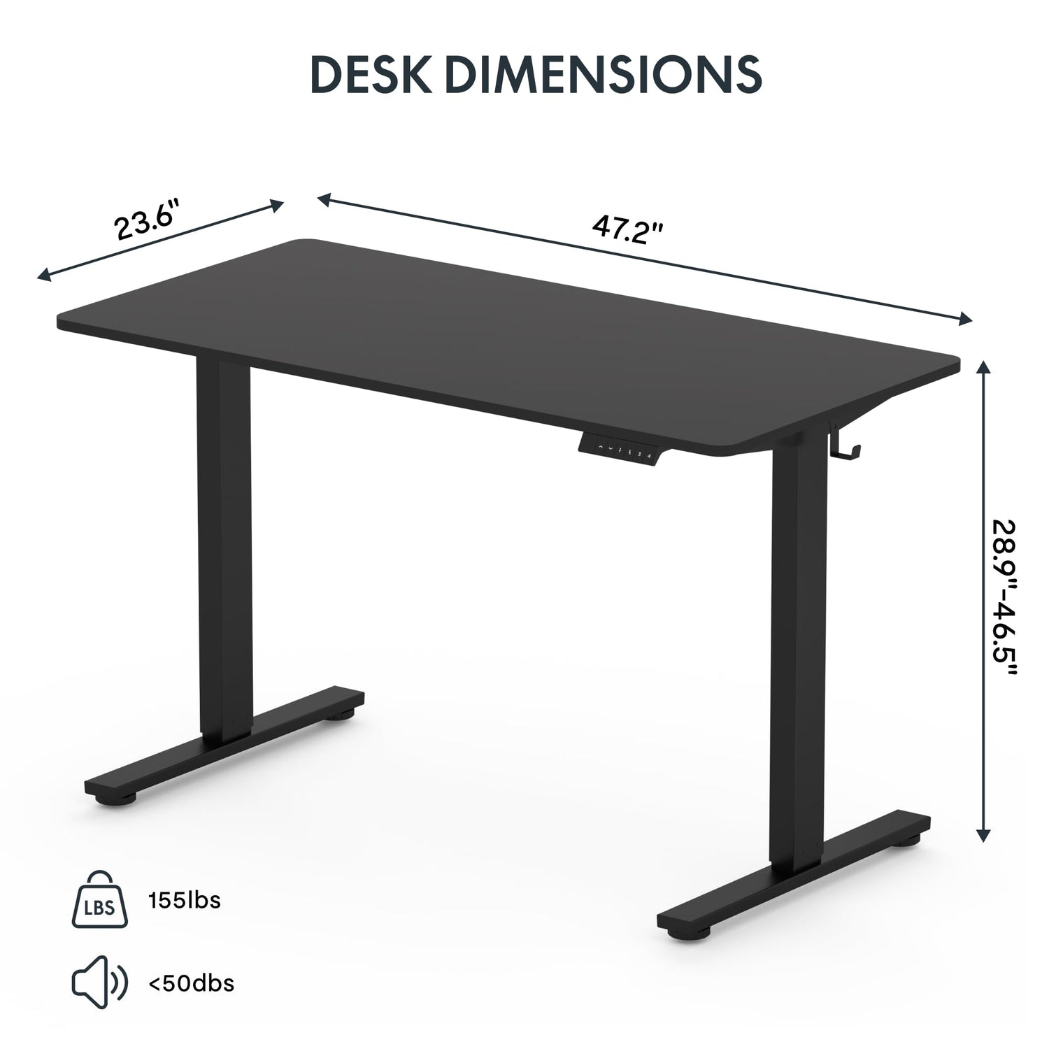 - QUIET ELECTRIC HEIGHT ADJUSTABLE SYSTEM: The motor lift mechanism offers smooth and quiet(noise under 50dbs) height adjustments from 28.9" to 46.5". Each desk leg goes through 20,000 lift tests.