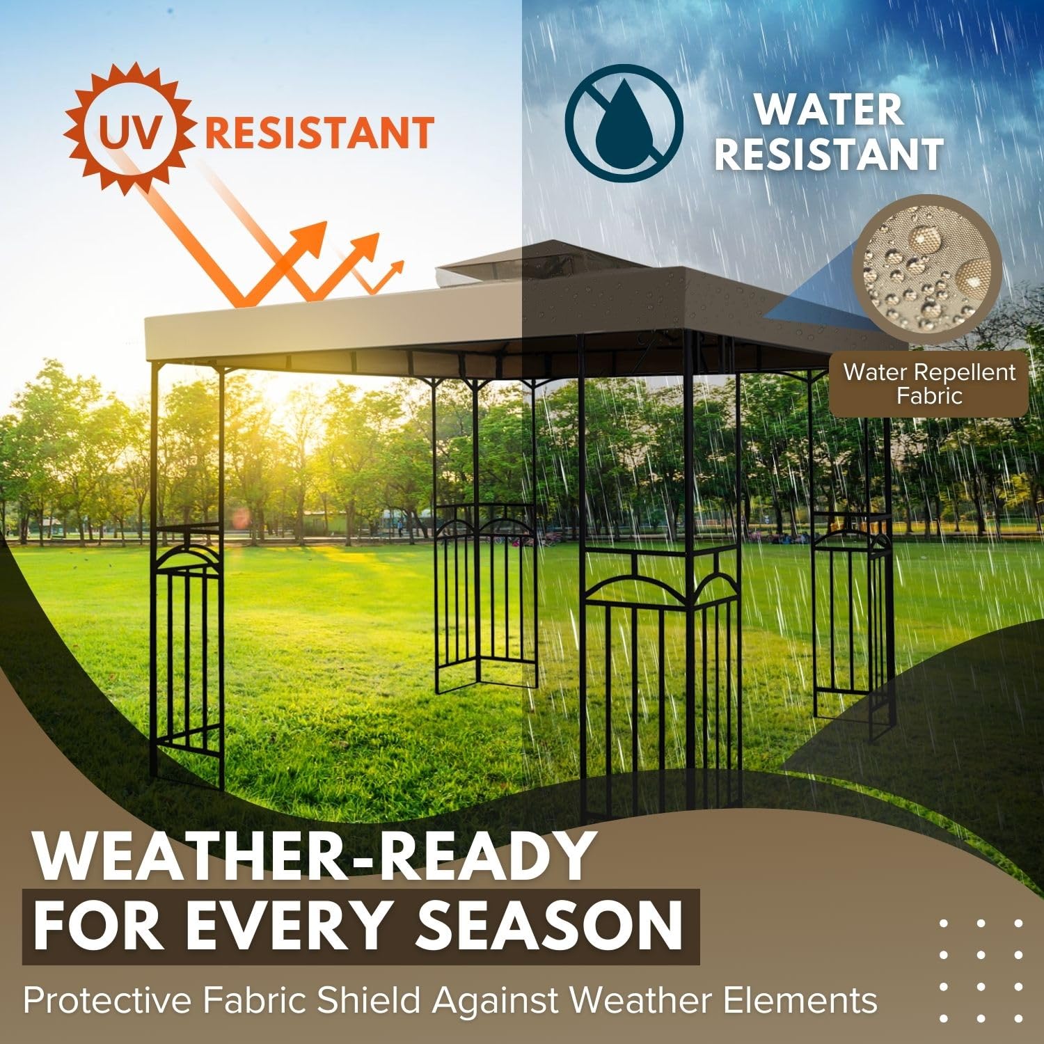 Feature: NOTE: 1. Please compare the size and specifications carefully for the best match. 2. This listing is for the canopy cover replacement only, the Gazebo frame and side walls are not included 3. Our gazebo canopy replacement is water-resistant to light rain but not meant to be used in HEAVY RAIN.