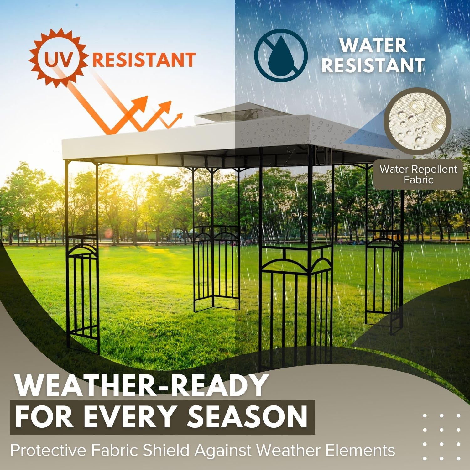 - Durable Materials - UV30+ 2-layer protective gazebo cover with an 180g/sqm polyester layer and a waterproof PA coating. It is entirely resistant to sunlight, wind, and rain, so you need not be concerned about the sun or wind