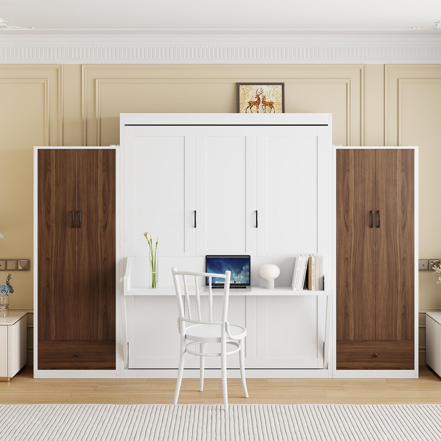 - [Full Murphy Bed with Desk] Equipped with a sturdy built-in desk, this Murphy bed transitions into a productive workspace in seconds. Perfect for remote work, studying, or writing, the desk holds your essentials without compromising comfort or design. A true space-saver that combines function and flexibility.