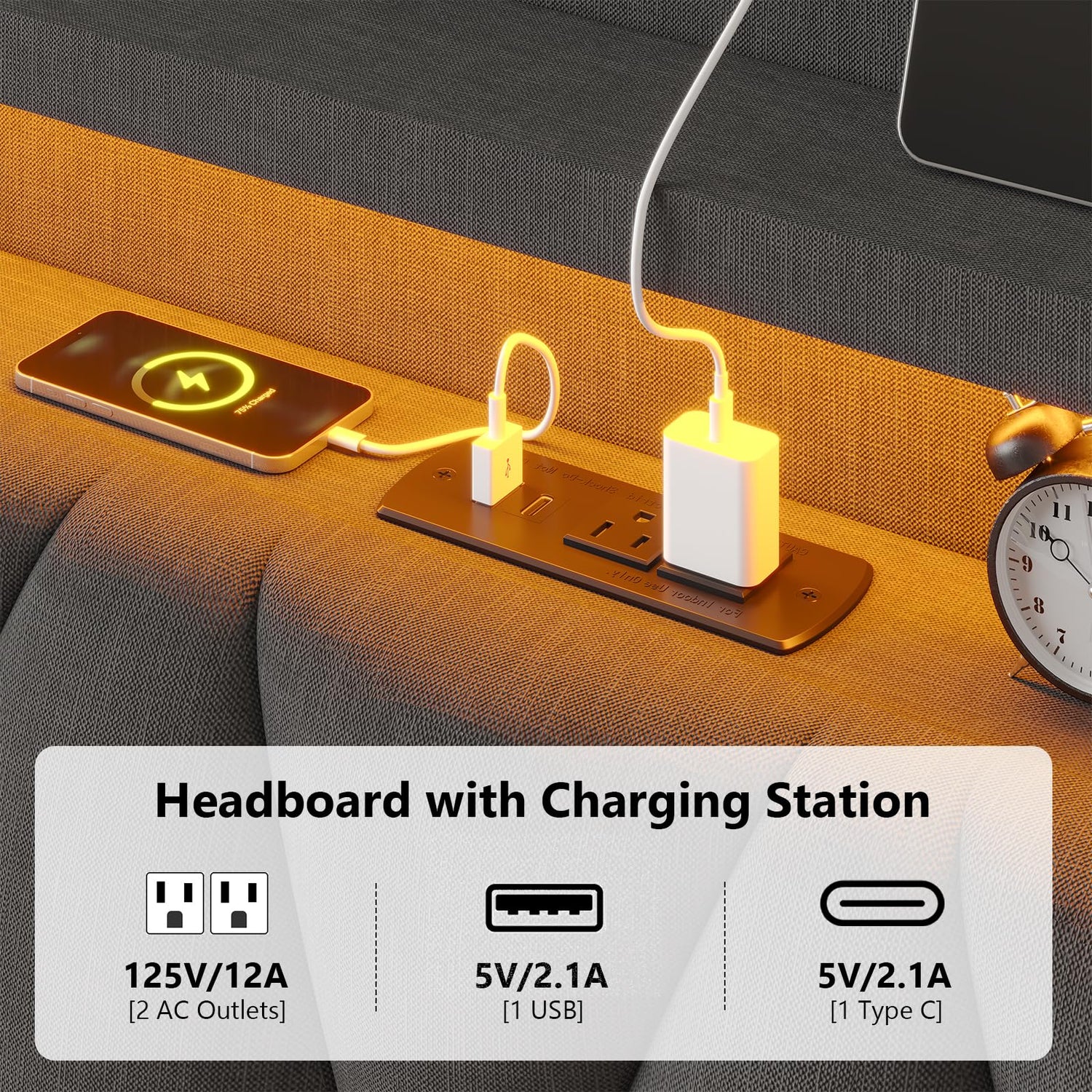 - 【Convenient Charging Station】 The king size bed frame with charging station contains 2 sockets, 1 USB, and 1 Type-C, providing a convenient location for charging electronic devices such as smartphones, tablets, or wearable gadgets while resting or sleeping