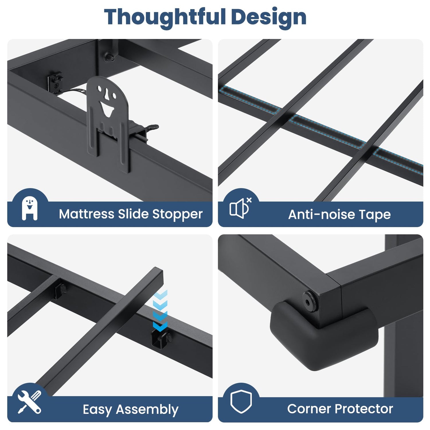 Crafted for stability and durability, this heavy-duty metal platform is built to last. Its strong construction includes a solid metal centre bar, closely spaced slats, and robust support legs, accommodating up to 600 lbs without the need for a box spring. Say goodbye to noisy nights; the innovative EVA foam material mute bar reduces friction, ensuring a tranquil sleep environment. Additionally, each frame is equipped with mattress slide stoppers and corner protectors, keeping your mattress securely in place.