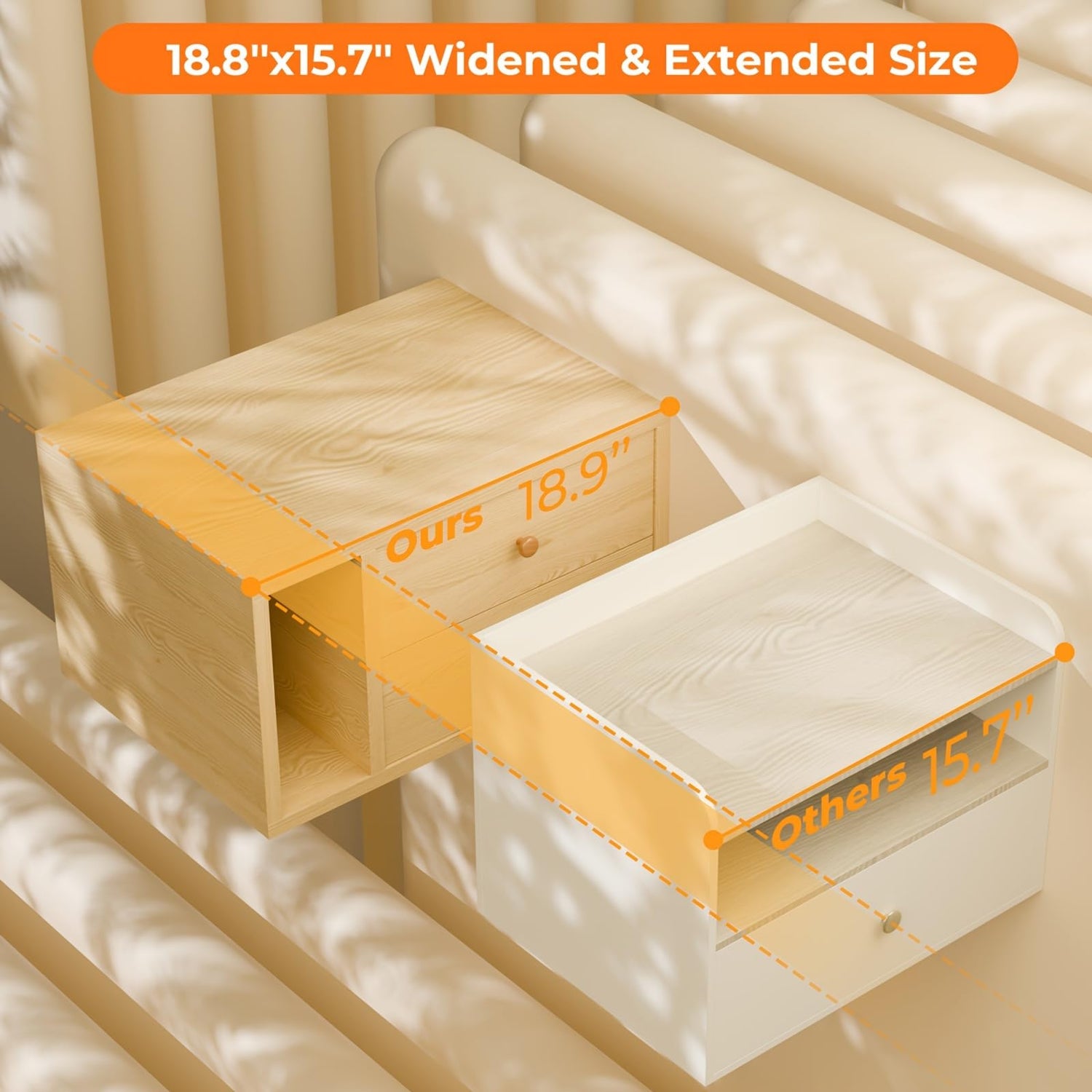 - [Spacious Storage Space]-Each floating nightstand has an ample tabletop, 2 drawers and an open compartment, offering an amazing large storage capacity. The closed drawer and open cubby provide ample storage space for all your bedside essentials. The tabletop can hold all your typical bedside essentials like books, magazines and glasses. The vertical open compartment also serves a display function and can place small objects you want to display.