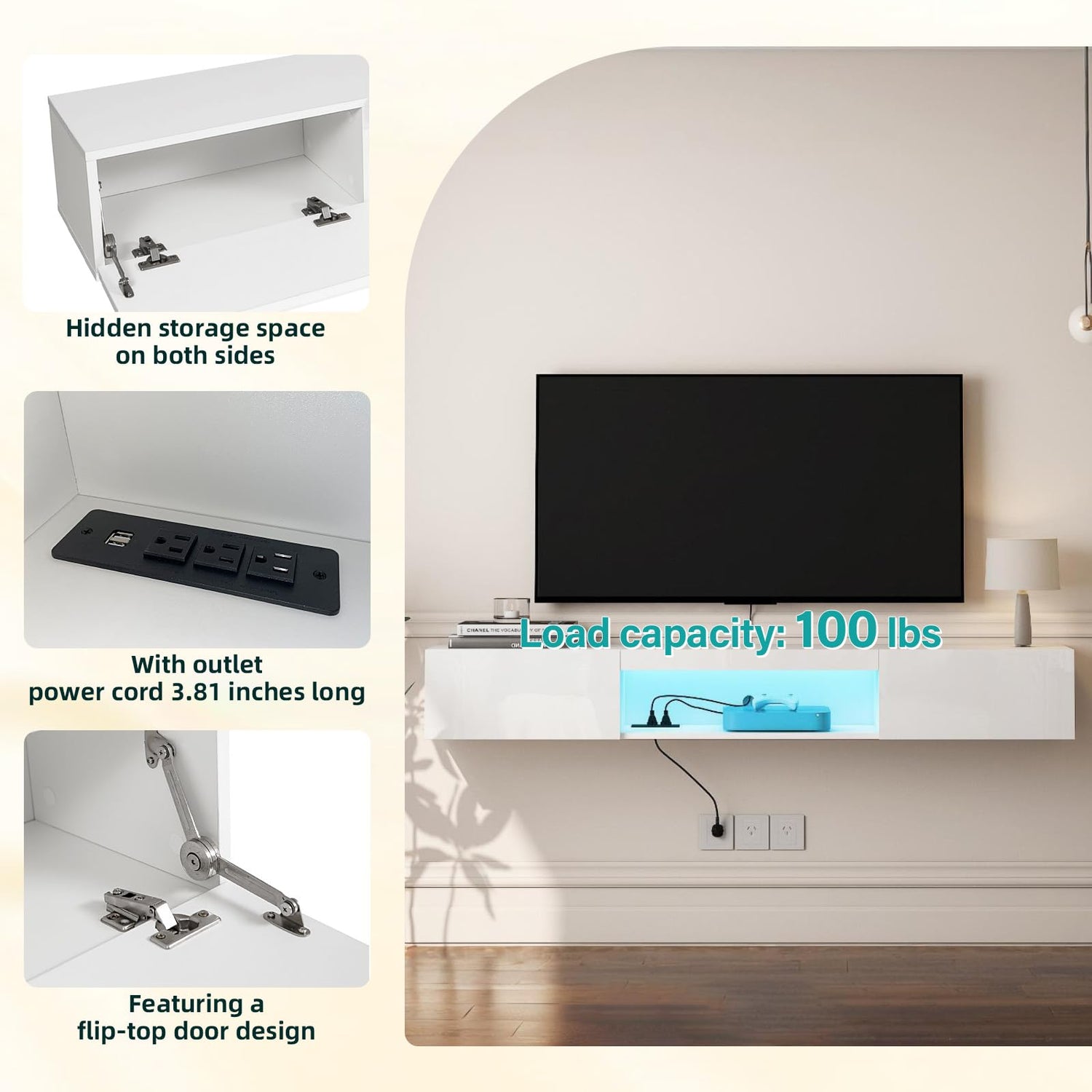 - Soft Closing Hinges: The spacious sideboard comes with soft closing hinges for a smoother closure. The floating TV stand uses thicker materials for stable support, can hold up to 100 pounds, and has a sturdy, durable construction for long-lasting use