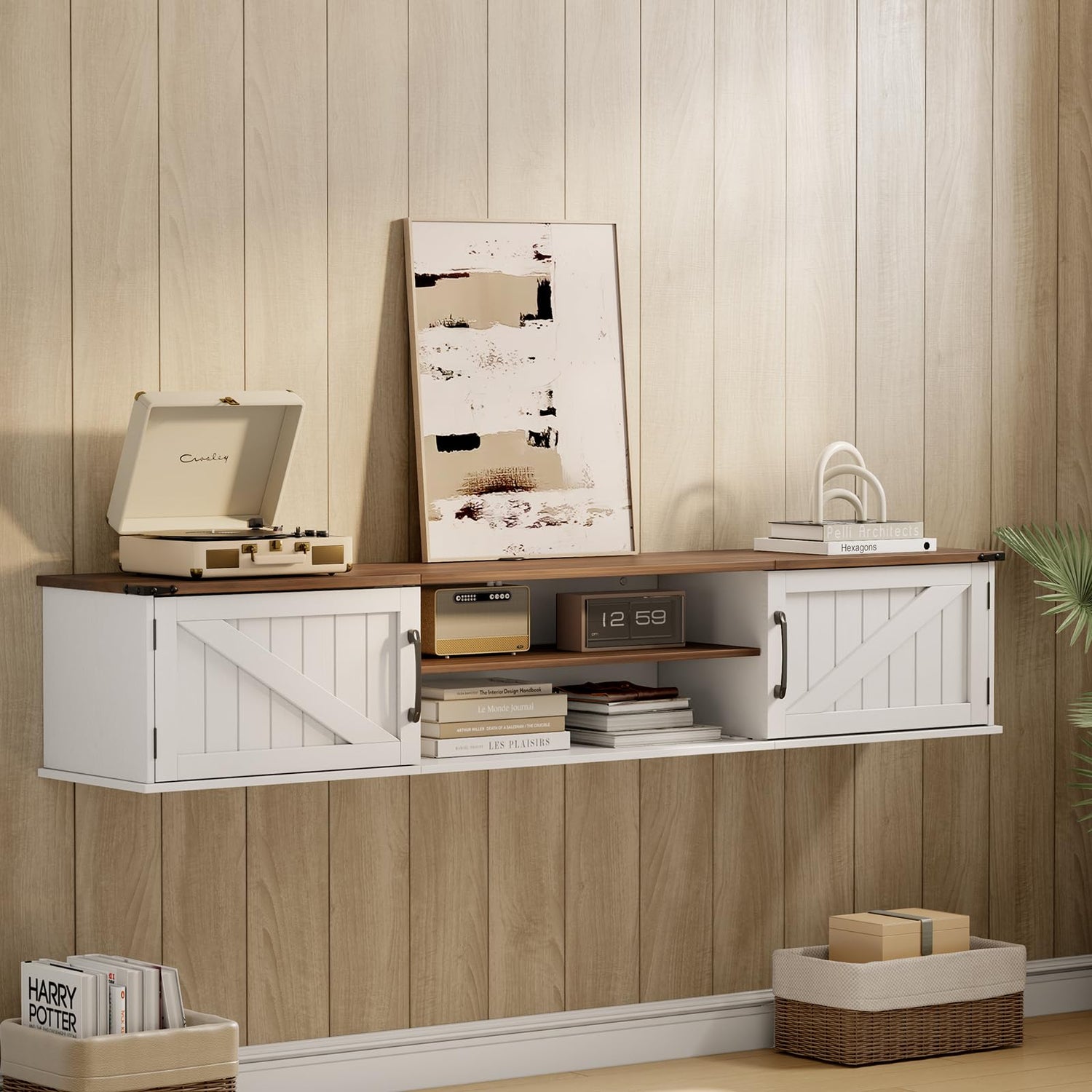 - [Classic Design] Modern wall mounted floating shelves feature a natural wood grain surface. Double hidden symmetrical doors on both sides cleverly protect privacy. Our wall mounted TV shelf has hollowed holes designed to conceal messy cords. With its chic design, it adds artistic beauty to your home, perfectly fitting in the living room, bedroom, study, or modern entertainment center.