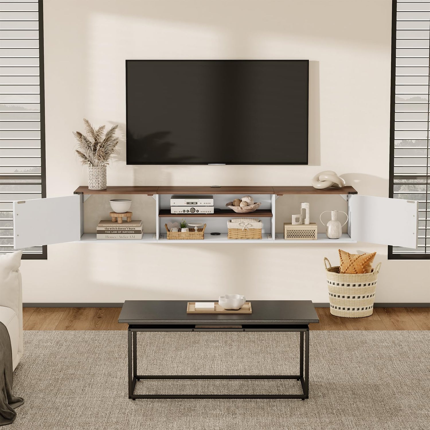 - [Space Saving Solution] Our wall mounted floating cabinet has plenty of storage space.The floating entertainment center with 2 storage cabinets with doors and 2 levels of open storage. Suitable for 55"/60"/65"/70"/75" /80" TVs, Up to 80 inches. This floating TV shelf saves each valuable inch of the floor and provides sufficient open and hidden storage space for your electronic devices and media equipment