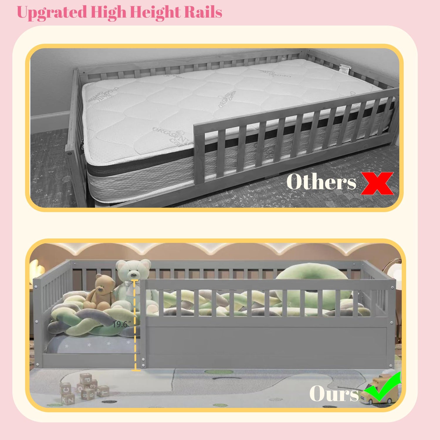 - 【Floor Bed with High Fence】: :Our twin size floor bed built with 20 inch height high guardrails. Make this Montessori bed can accommodate various thickness of mattress. Fence with baffle design, effectively to prevent children's hands and feet to clamp the risk of toys and various items falling risk.