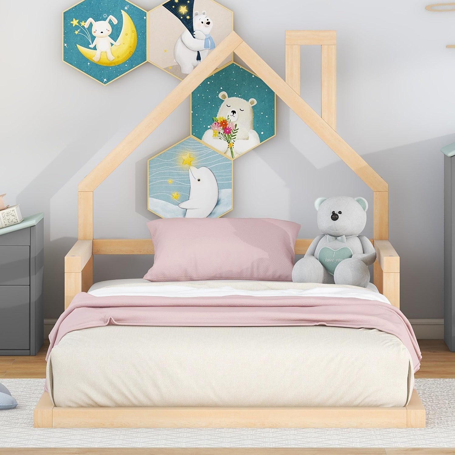 Transform your child's room with the Bellemave Twin Size Montessori Floor Bed, featuring a delightful house-shaped headboard and sturdy railings in a beautiful natural finish. This charming bed is not only a functional addition but also a stylish piece that effortlessly complements various types of home decor.
