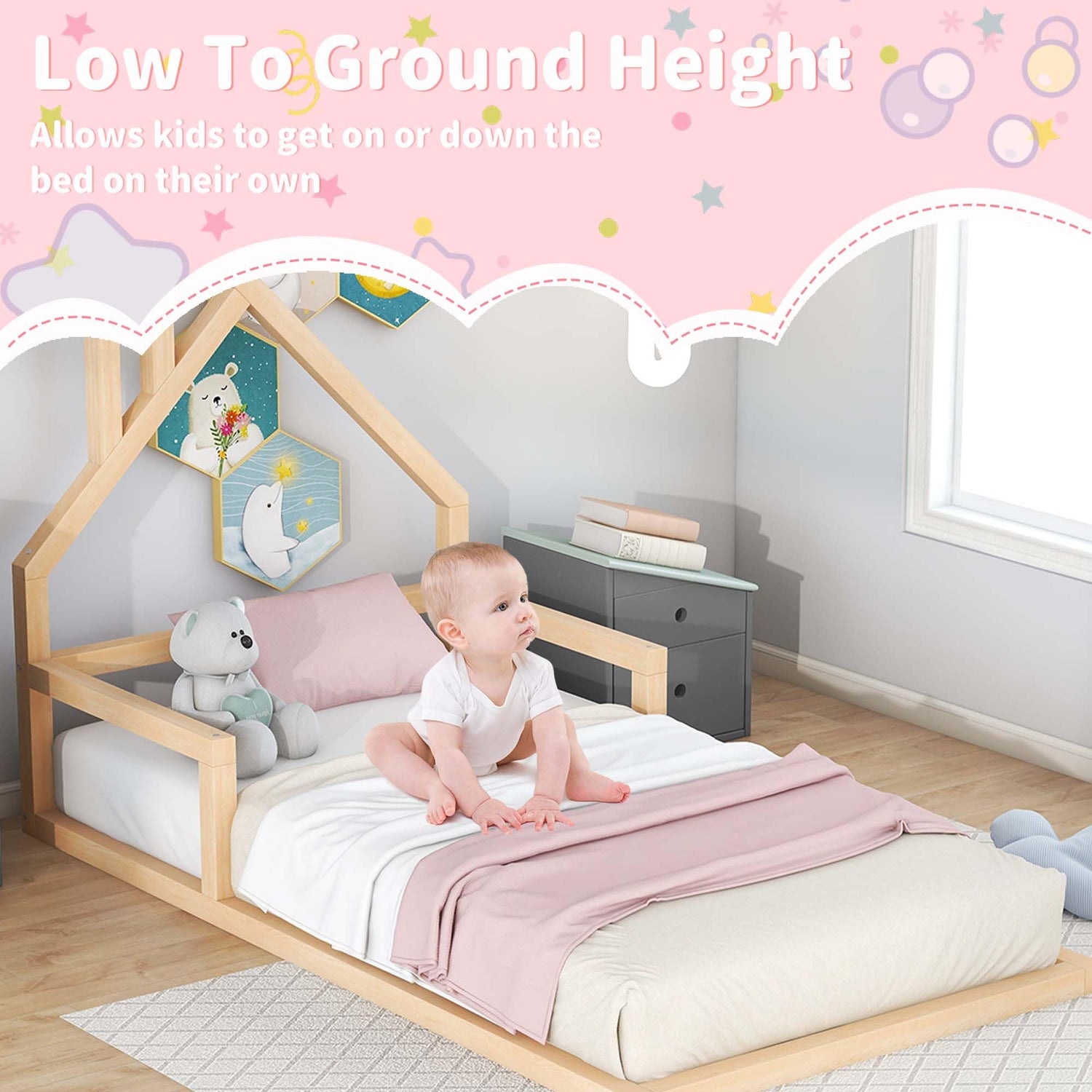 Bellemave Twin Size Montessori Floor Bed with House-Shaped Headboard and Railings in Natural Finish