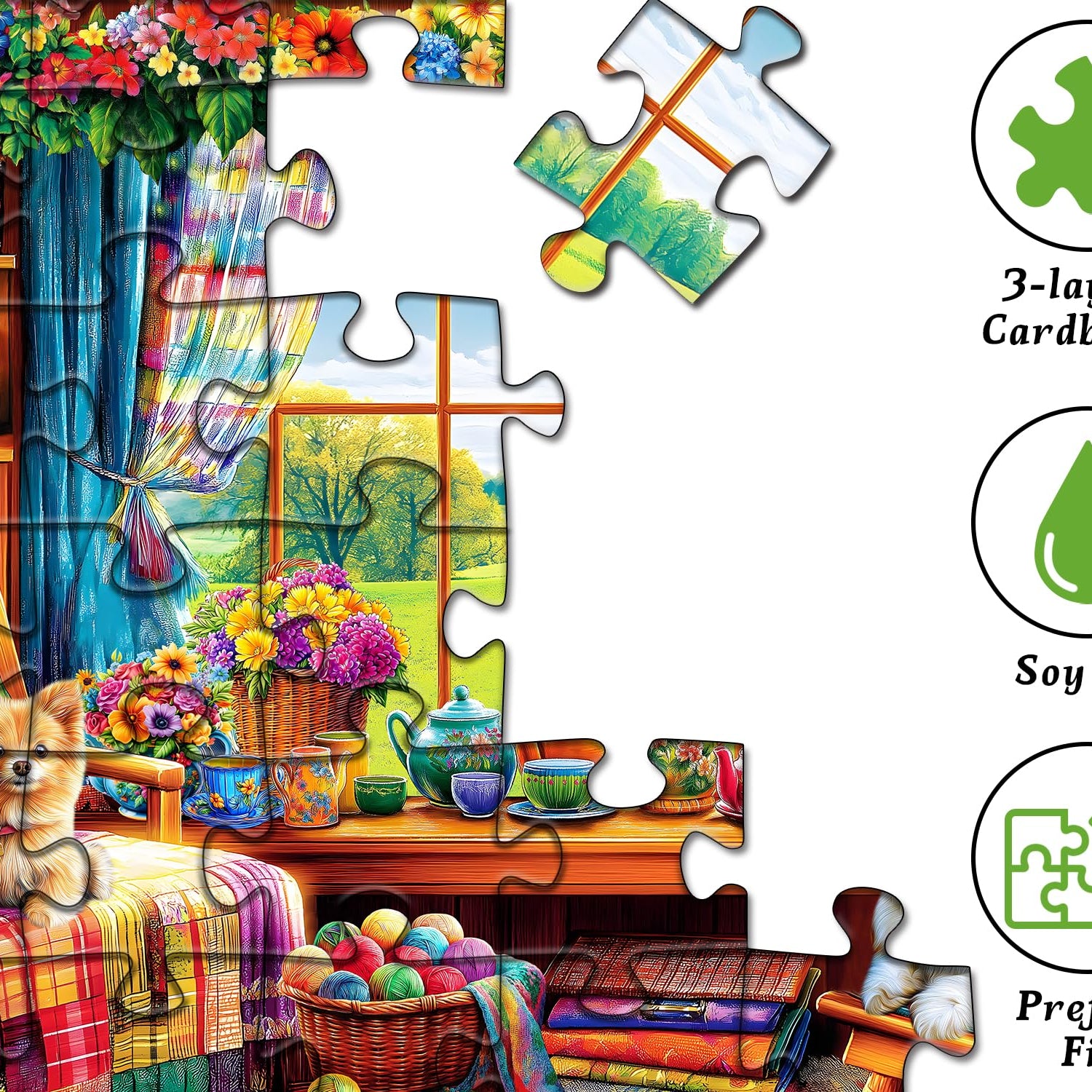 - Colorful flower puzzles for adults 1000 pieces: Experience a cozy countryside scene with this charming puzzle. Featuring a sunlit room filled with vibrant flowers, colorful teapots, and warm patchwork quilts, a fluffy cat and an adorable puppy complete this inviting setting