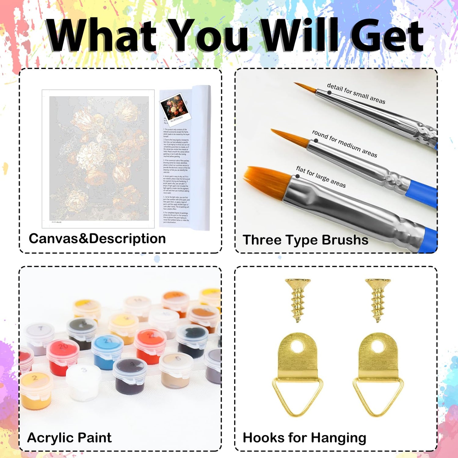 - Package Inculude:With the purchase of Flower Paint by Number Kits you will get:1 pre-printed textured art canvas,1x acrylic paints,1x paint by number brushes,1x hooks.You only need to color according to the numbers to complete beautiful art