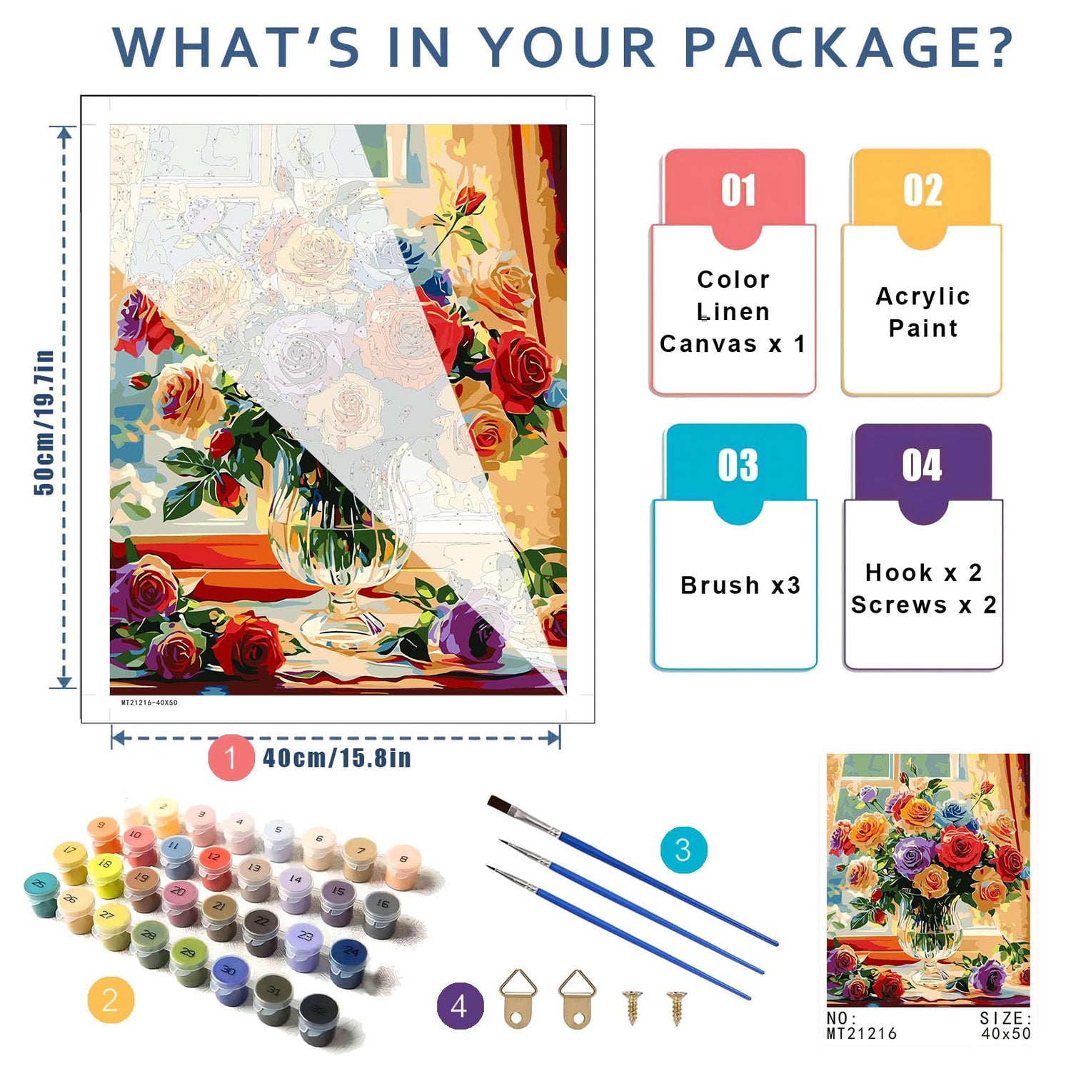 - Flowers Paint by Number Package: 1 set of digital painting including 1pcs pre-printed textured canvas (unframed), 1 set acrylic paints, 3 different size brushes, 2 hooks and 2 screws. Open the package and you can start painting immediately