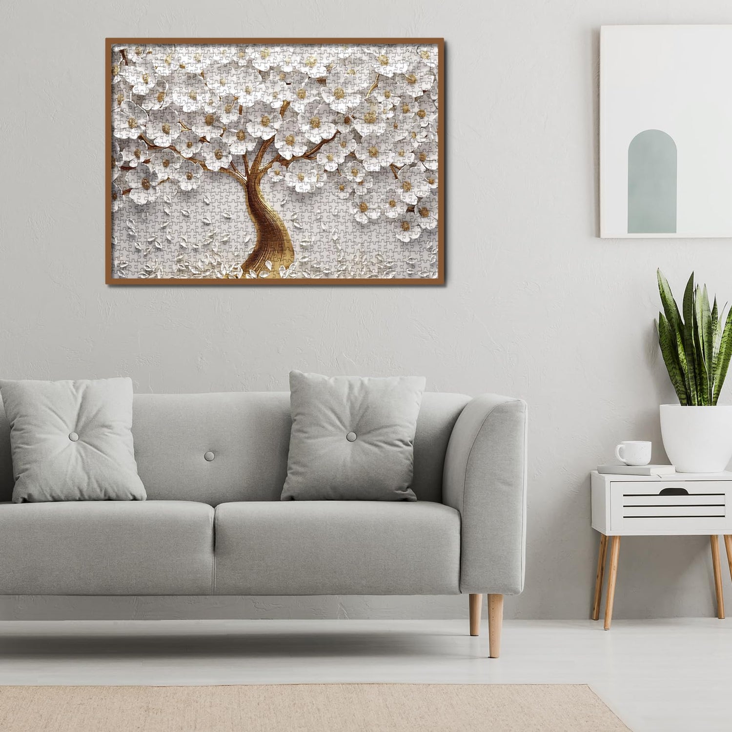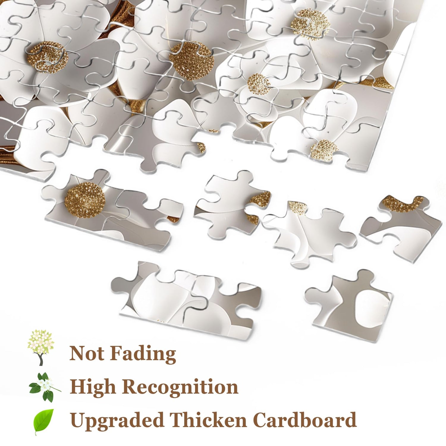 - Tranquil Tree Puzzle: a captivating decorative artwork, featuring a stunning interplay between a golden tree trunk and pristine white blossoms, conveying an elegant, serene, and slightly dreamlike atmosphere