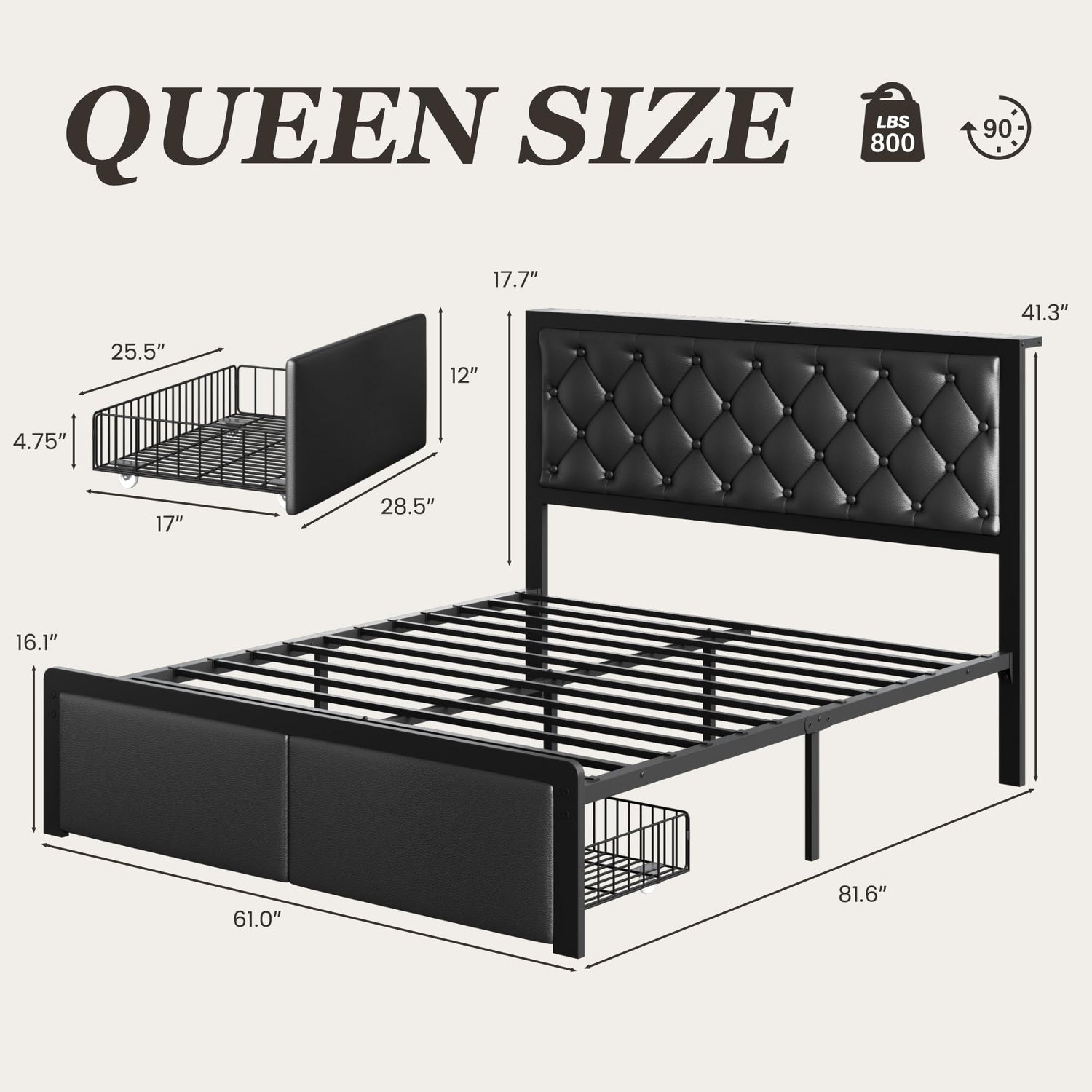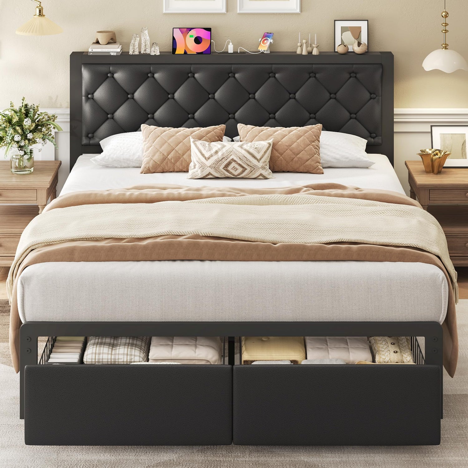 Fluest Queen Bed Frame with 2 Storage Drawers, Upholstered Headboard Button Tufted Bed Frame with Charging Station, No Box Spring Needed, Noise-Free, All Metal Structure, Black