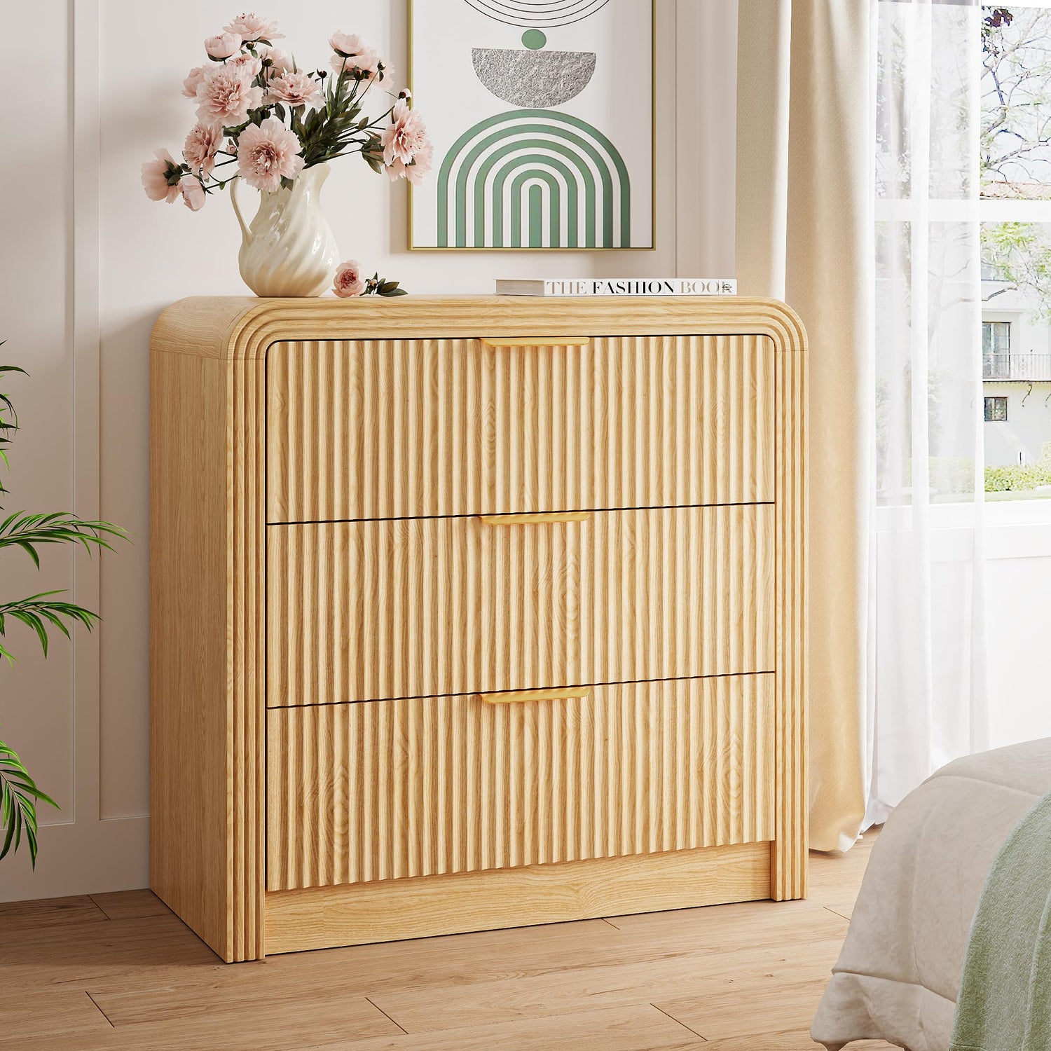- Unique Fluted Design with Rounded Corners: This dresser combines a modern fluted waveform front and sleek rounded edges with elegant gold metal handles; This harmonious blend of subtle texture, soft curves, and a touch of metallic luxury creates a stunning focal point for any room, beautifully uniting modern minimalism with warm wood tones