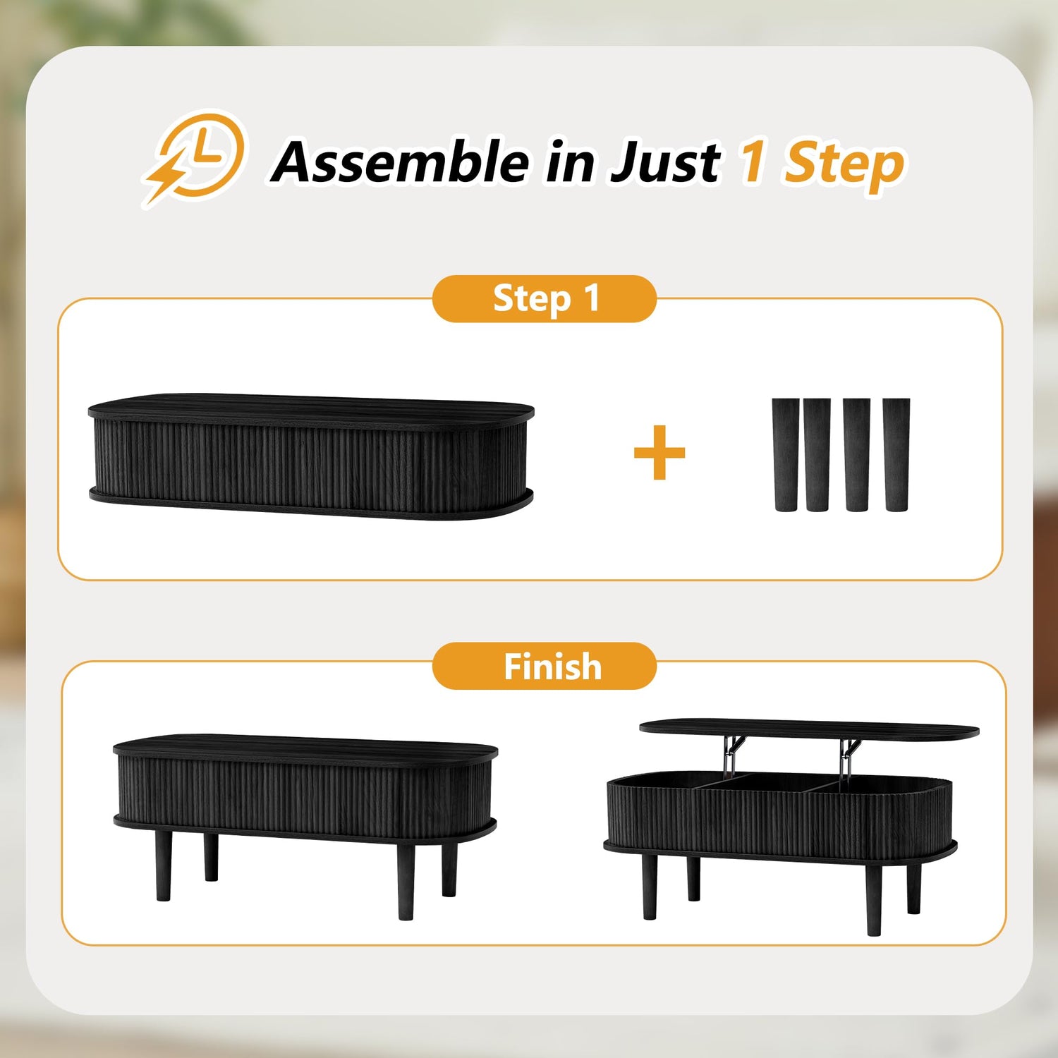 Fluted Lift Top Coffee Table with Hidden Compartment, Fully Assembled Wooden Center Table, Modern Oval Lift Tabletop for Home Living Room Office, Black