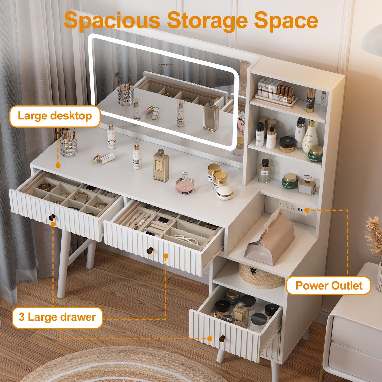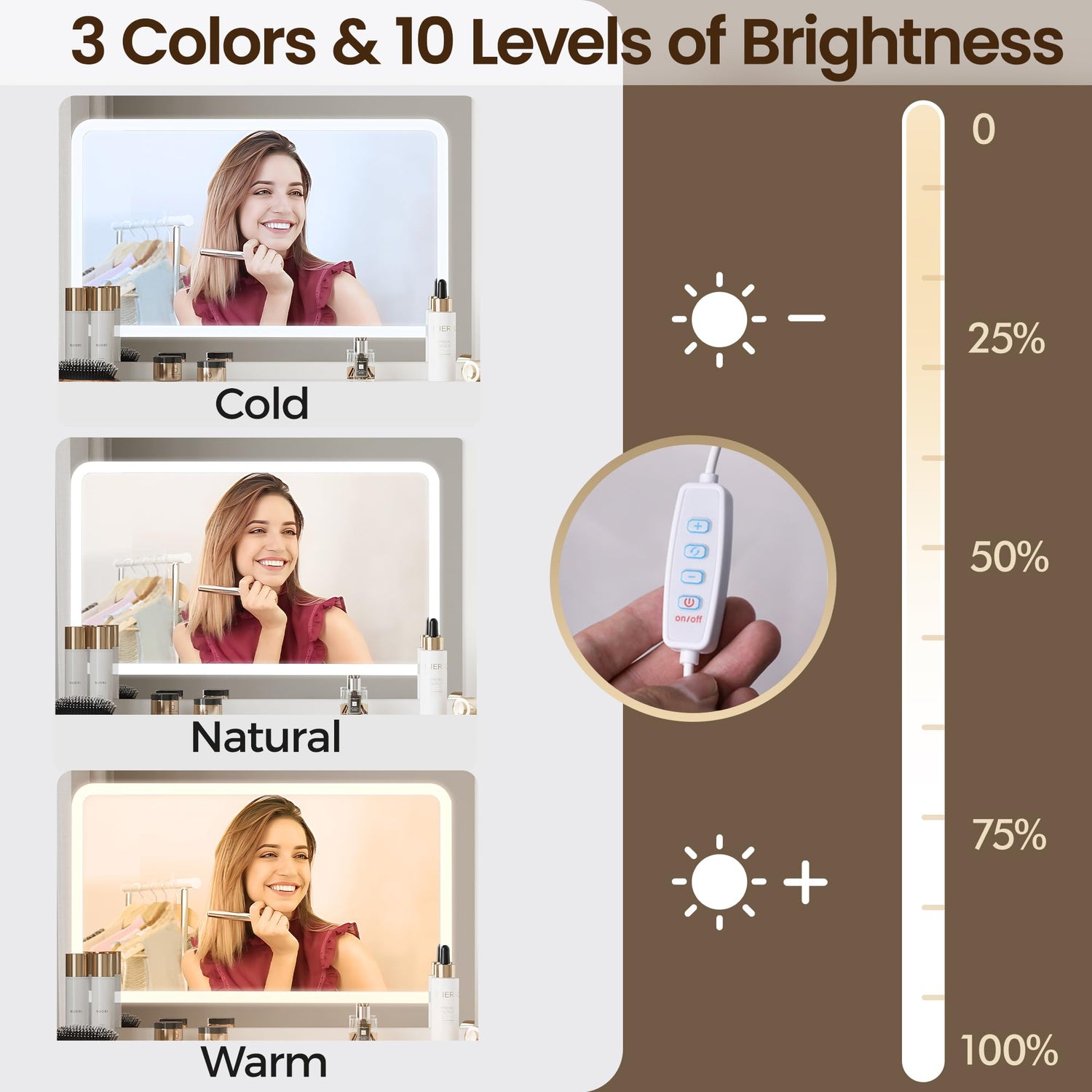 - 【3 Modes Adjustable LED Lights & 36" Large Mirror】This dressing table has a 36" HD lighted mirror, and the mirror can be adjusted with 3 different lights(natural, cool, and warm) , whether it is day or night, to create the ideal makeup atmosphere, so that you have the best makeup.