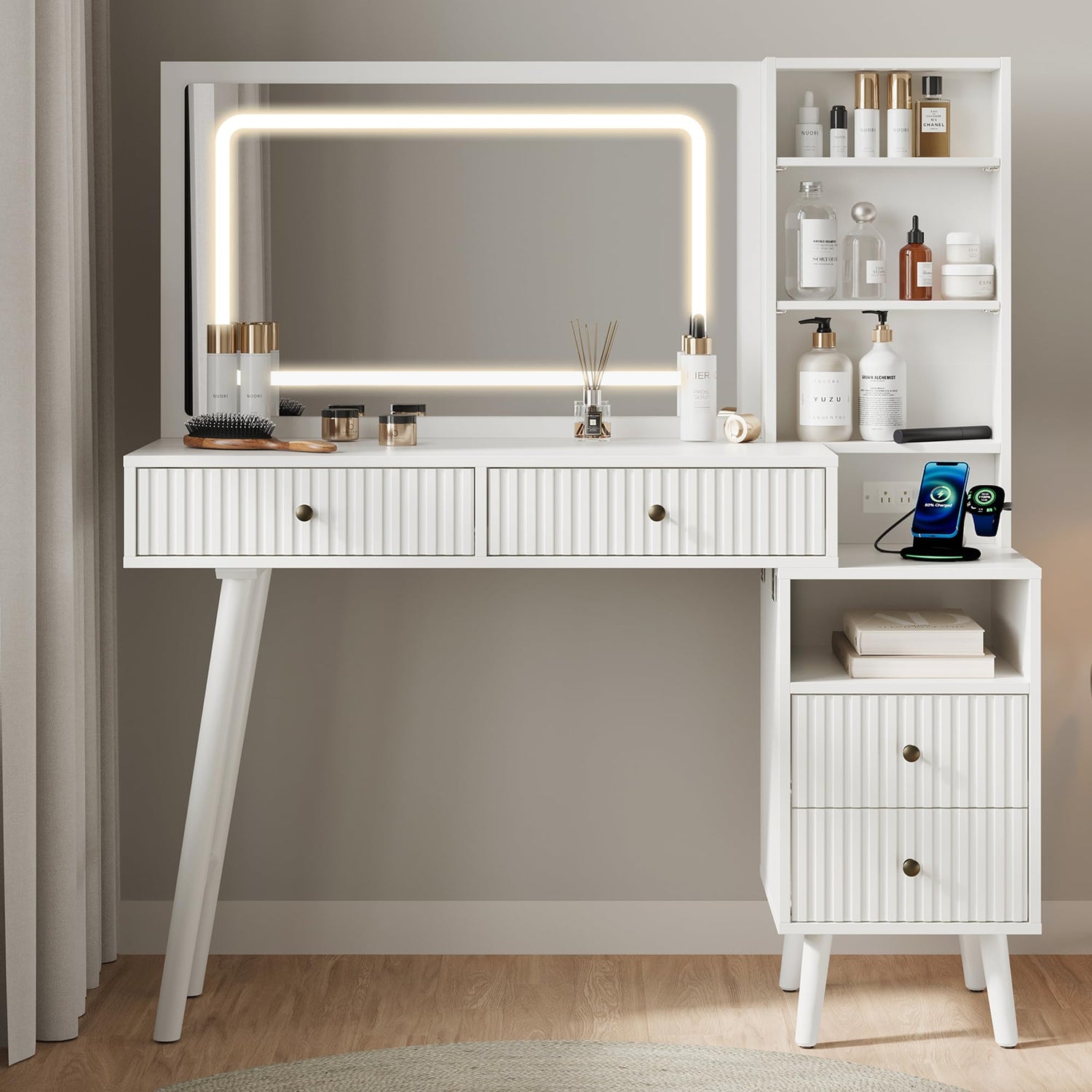 Fluted Makeup Vanity Desk with 36" Large Mirror and 3 Modes Adjustable Lights, 48" Big Modern Vanity Mirror with Lights and Charging Station, Vanity Table with Drawers and Solid Wood Legs for Bedroom