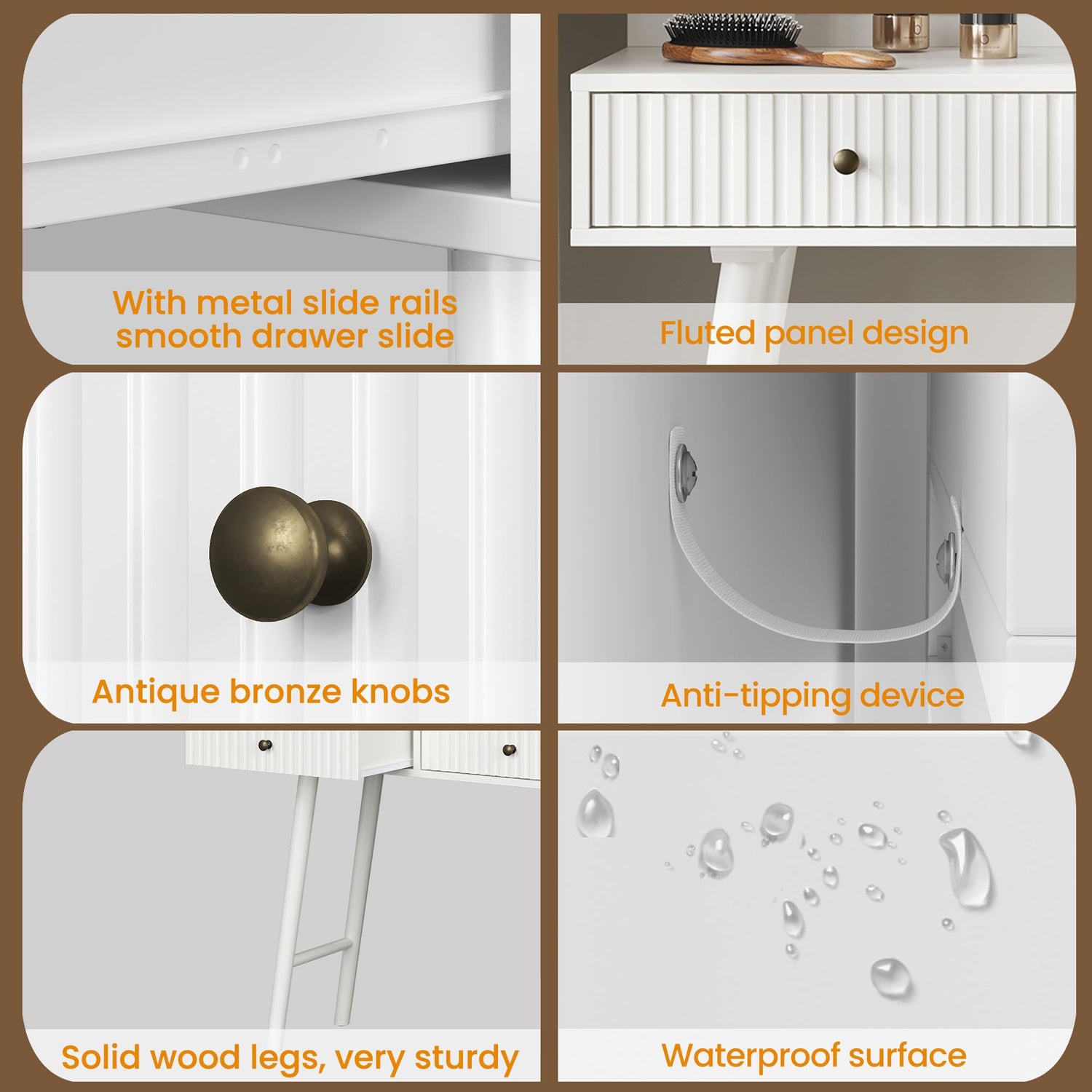 - 【Sturdy & Stylish】Made with P2-grade wood, this makeup table offers a solid, sturdy structure and a smooth finish. The unique fluted drawer panels and stylish solid wood legs combine beauty and stability. Ideal for bedrooms, living rooms, or closets, it adds a touch of fashion and artistry. Dimension: 48.03''(L) x 15.75''(W) x 53.15''(H)