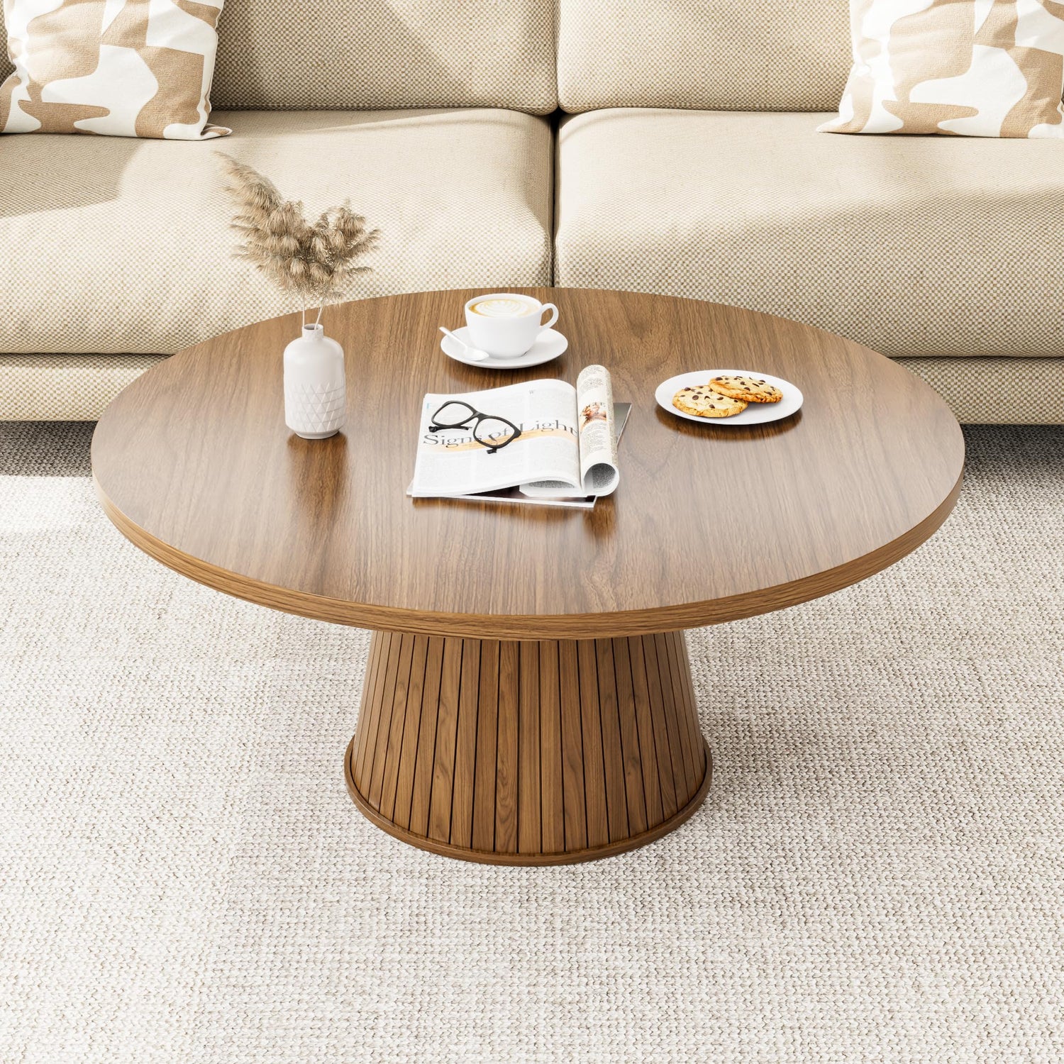Fluted Round Coffee Table, Walnut Mid Century Modern Coffee Table, Small Circle Center Table, Brown, Farmhouse Wood, for Living Room, 31.5 Inches, Rustic, Easy Assembly
