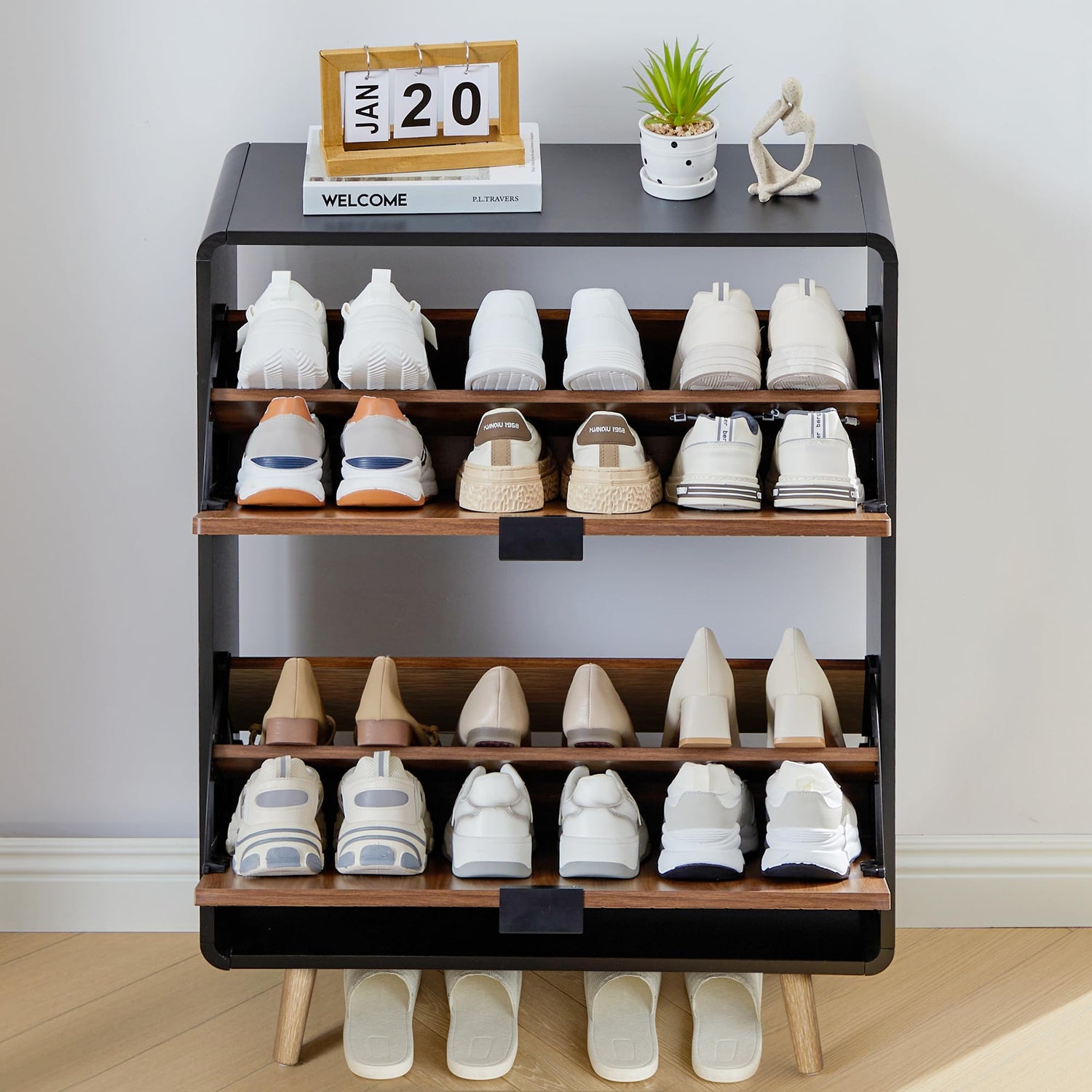 - Curved Flip-Drawer Shoe Cabinet: This modern freestanding shallow shoe cabinet organizer adopts a space-saving flip-drawer design, making it easy to open and close. Compared to ordinary closed shoe racks, this cabinet not only protects shoes from dust and pet damage but also maintains the aesthetic appeal of your space. The slim cabinet has a sturdy structure and an impressive load-bearing capacity of up to 100 pounds.