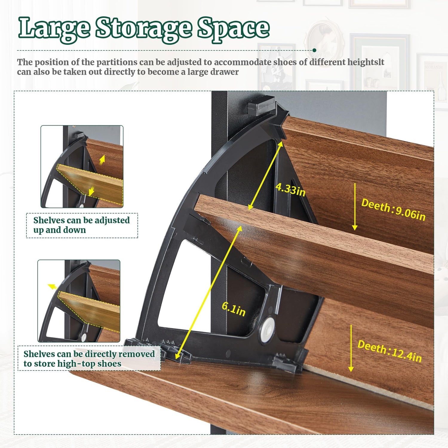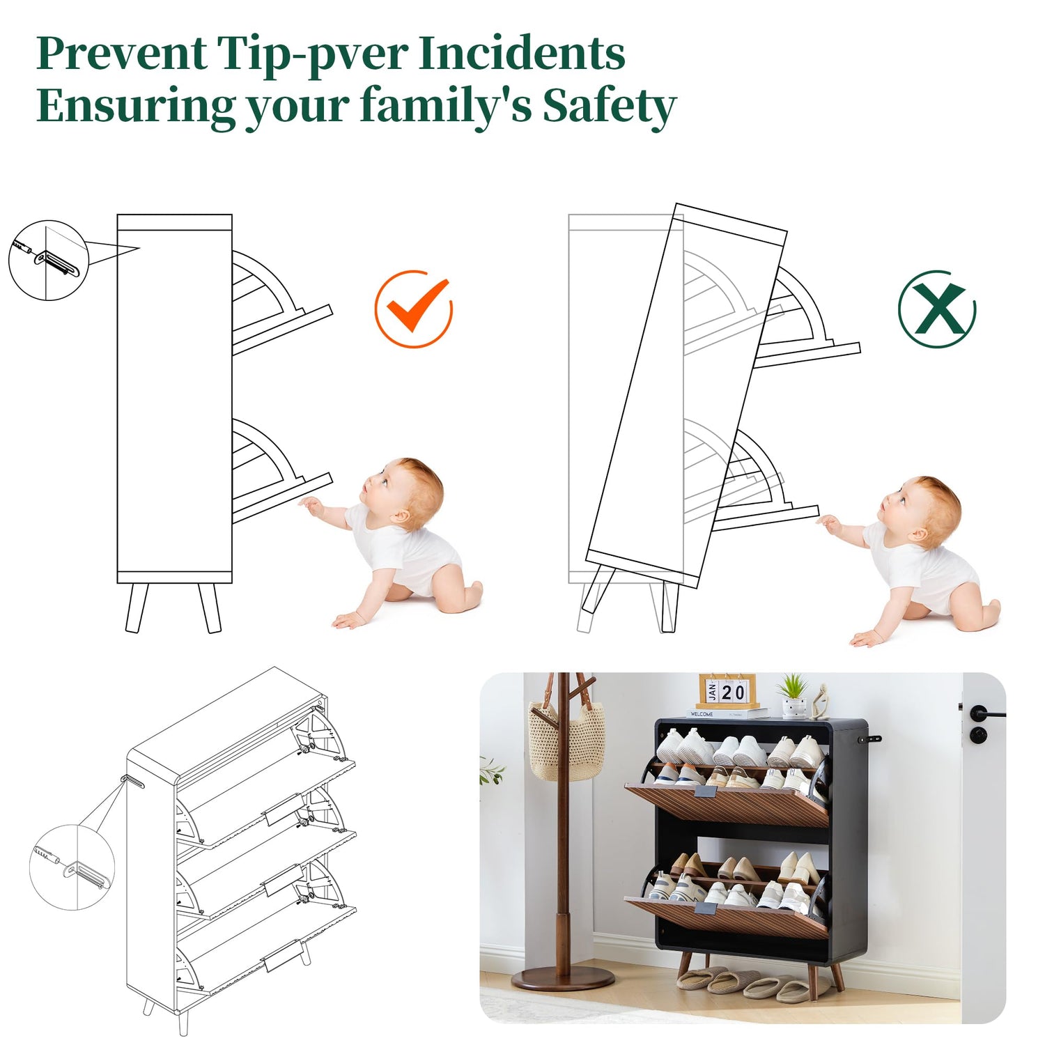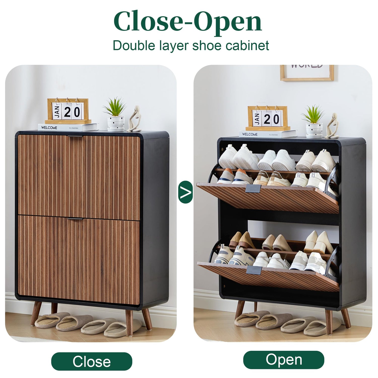 - Fluted Wood Shoe Holder Cabinet: Featuring bold contrasting colors and unique line groove designs, this mid-century modern-style slim shoe cabinet is both functional and elegant appealing. Equipped with an anti-tip device that can be fixed to the wall, it prevents tipping. Five sturdy wooden legs protect floors from scratches, and the smooth curves reduce sharp edges, making it a safe choice for homes with children or pets.