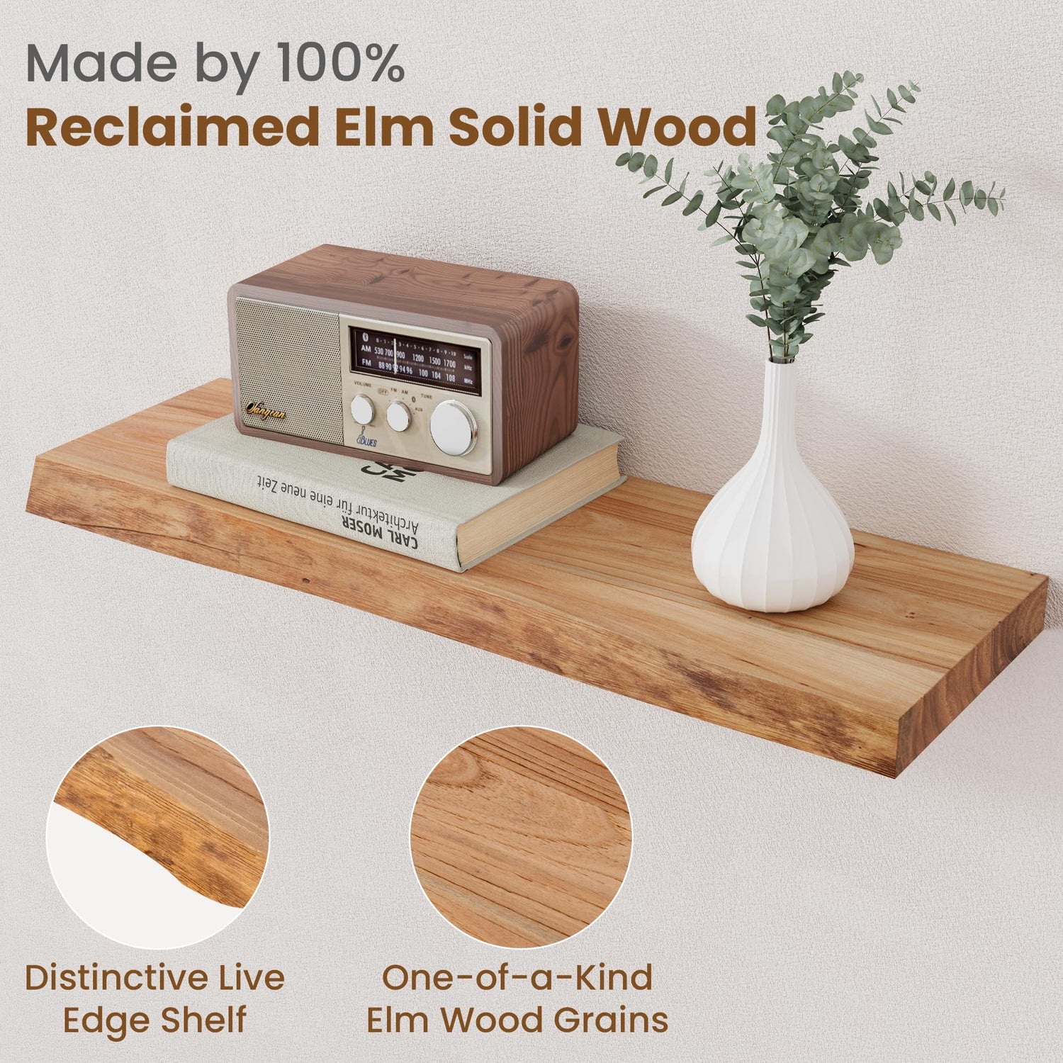 - Solid Elm Wood: Our rustic live edge floating shelves are made of reclaimed elm wood, each floating shelf has a unique natural grain, color, holes, and knots. Don't worry about holes and knots, these are elm itself so you can feel the feeling of nature
