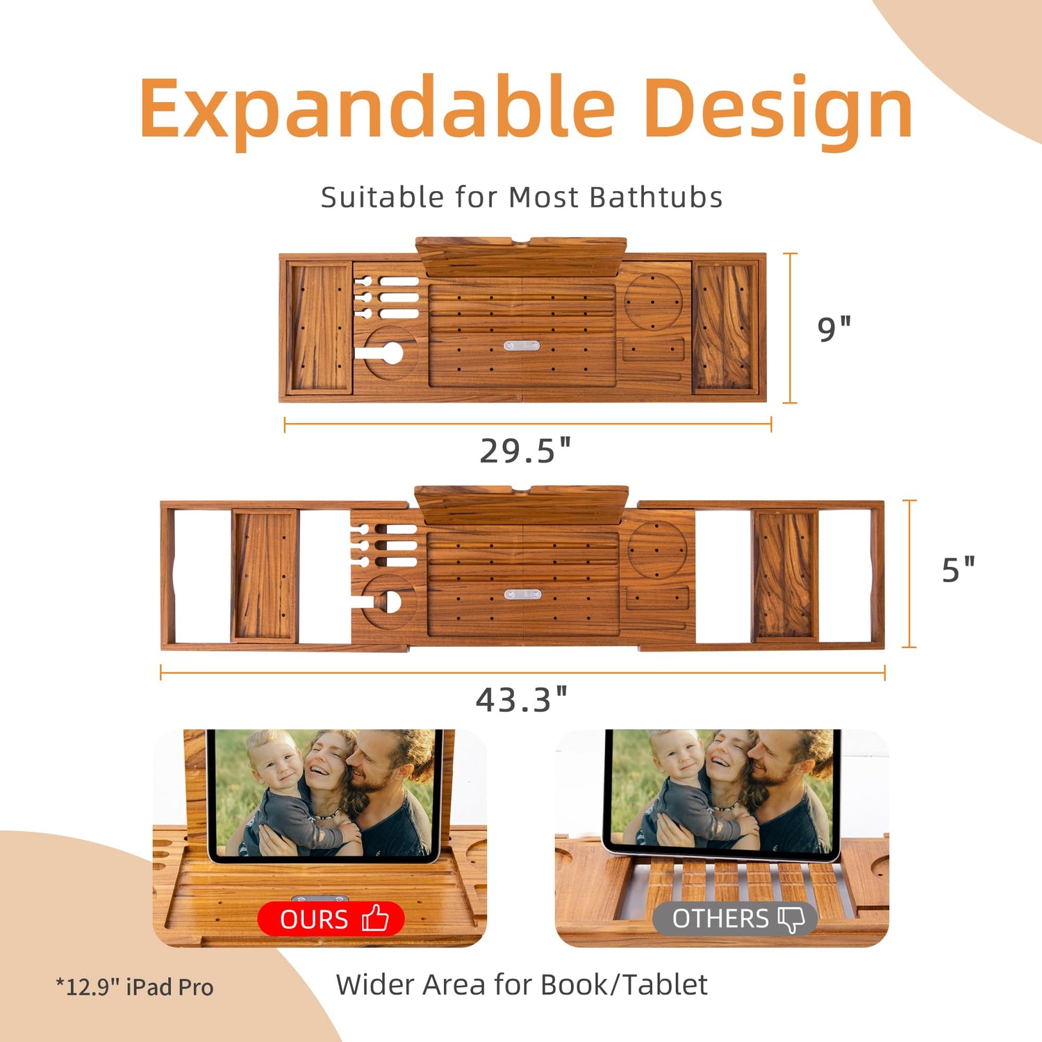 - Adjustable to Fit Any Bathtub: Our bathtub caddy tray is designed to expand from 29½” to any length until 43”, accommodating both single and double tubs. The silicone grips keep it secure, while the three angled book/tablet slots ensure the perfect viewing angle. The 11½" width is generous enough to hold an 12.9''iPad Pro