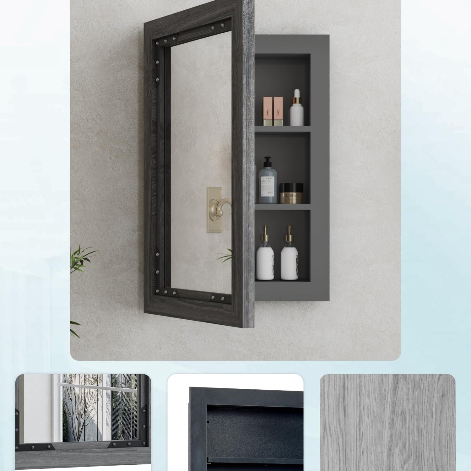 FLYJOE Medicine Cabinet Mirror 16 x 24 Inch Farmhouse Bathroom Mirror Door Solid Wood Storage Cabinet with Adjustable Shelves, Wall Mounted for Bathroom Living Room, Grey