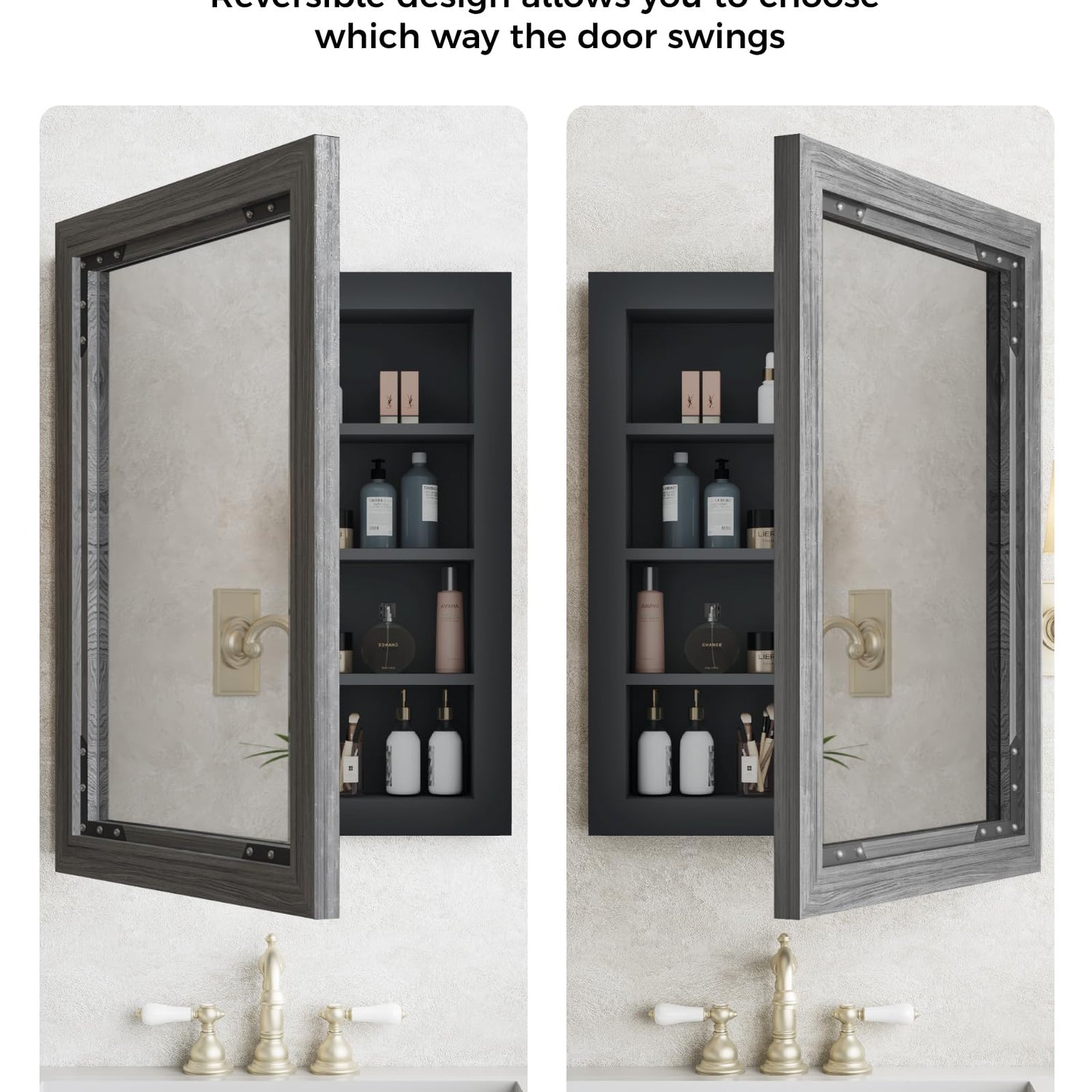 - Versatile Mounting Options: The medicine cabinet is adaptive to bathrooms of various space sizes, with various models and sizes available. The 180° reversible door design ensures your personal needs. (Tip: This medicine cabinet is only suitable for mounting on the dry wall surface)