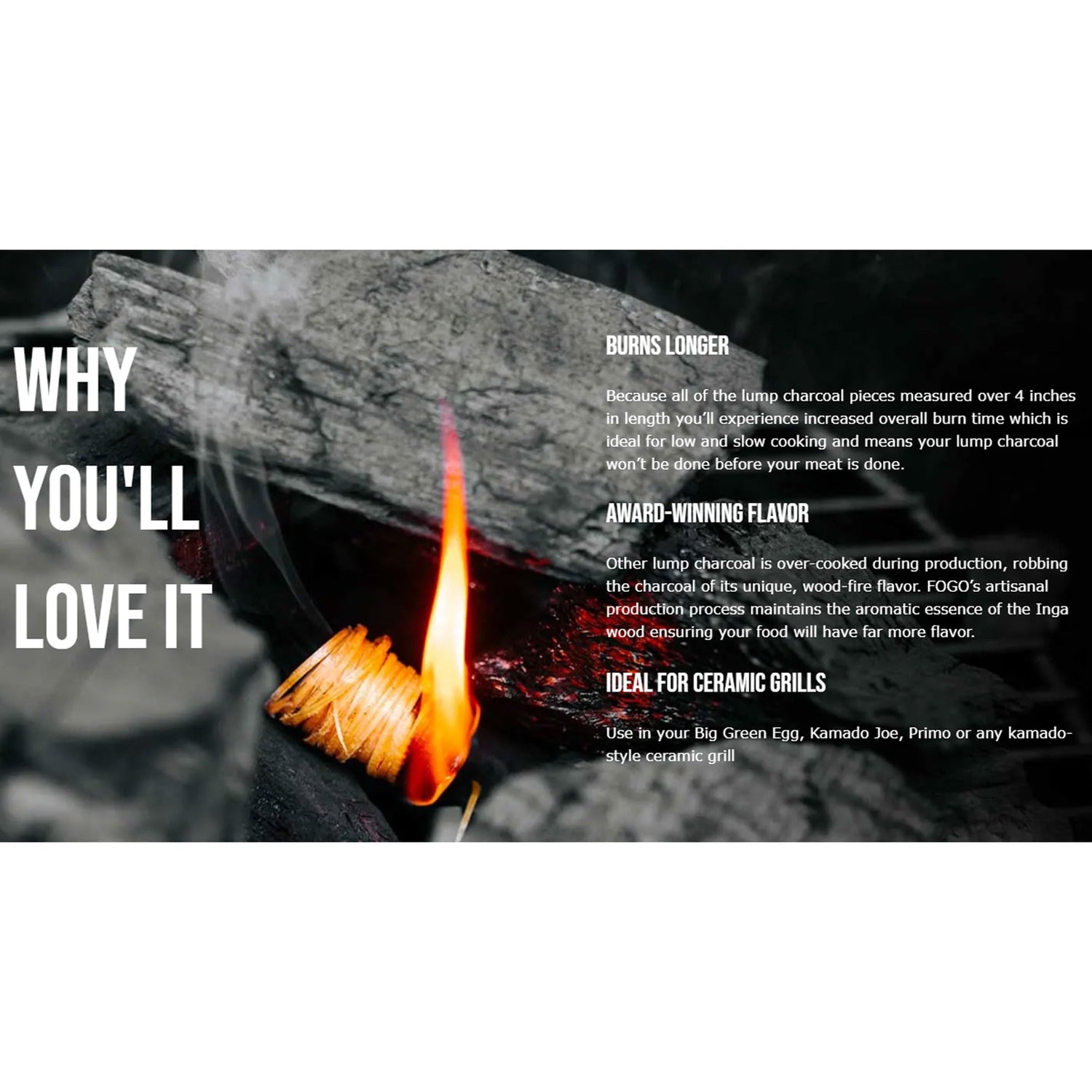 Details: Fogo Super Premium All Natural Hardwood Charcoal is made from dense Central American Hardwoods and only hand selected pieces make it into every bag to ensure that you get the very best charcoal you can find. Fogo means Fire and that's what Fogo is-it lights very quickly and is ready to grill within 15 minutes. It burns very hot, searing the meat and locking in the flavors and it lasts longer than other charcoal you can find. Fogo is a completely natural product that is made exclusively from dense hardwoods and using selected trees with no other added ingredients whatsoever. Fogo is an all natural, high quality product that imparts your food with the very best flavor and taste. Fogo is also used by a number of exclusive restaurants around the country to prepare their food. Fogo is produced sustainably in cooperation with government organizations using mainly tree trimmings and trees that have been marked for removal as well as ensuring continued reforestation.