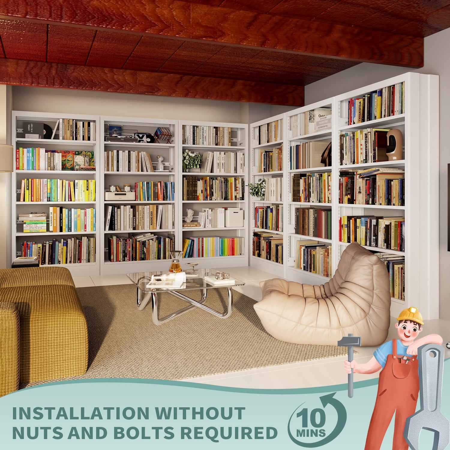 FogQueen 71" Metal Book Shelf,5 Tier Bookshelf with Adjustable Shelves,White Bookshleves and Bookcases,Heavy Duty Library Book Case,Modern Open Bookshelf for Living Room,Bedroom,Office (White)