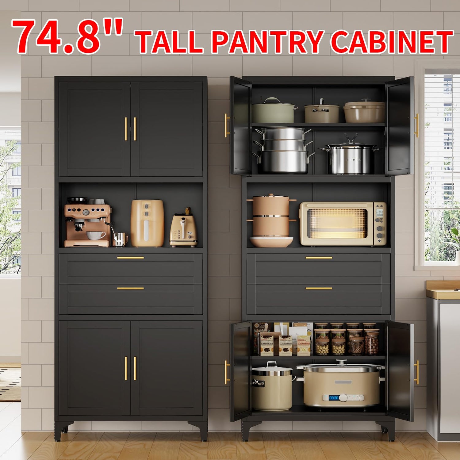 FogQueen 75" Tall Metal Storage Cabinet,Pantry Storage Cabinet with 2 Drawers and Open Space,Kitchen Cupboard with Adjustable Shelves,Multi-Functional Cabinet for Living Room,Bathroom,Garage (Black)