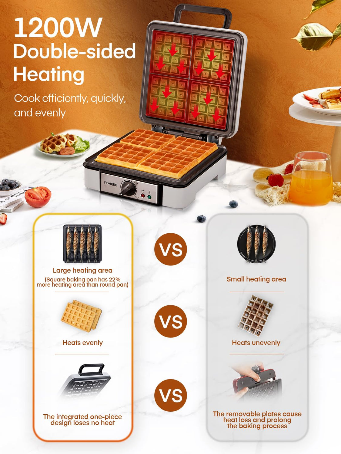 - ๐พ๐๐๐๐๐๐๐๐ ๐๐ ๐ฉ๐๐ ๐ญ๐๐๐๐๐: Save time by making 4 slices of 4"x4" delicious Belgian waffles within one batch, 1200W powerful heating for churning out waffles in just 4-5 minutes (for waffle batter) or even 2-3 minutes ( for waffle dough). No more need to bake a bunch of waffles in advance and freeze them. Big families can say goodbye to frozen waffles and enjoy fresh Belgian waffles anytime