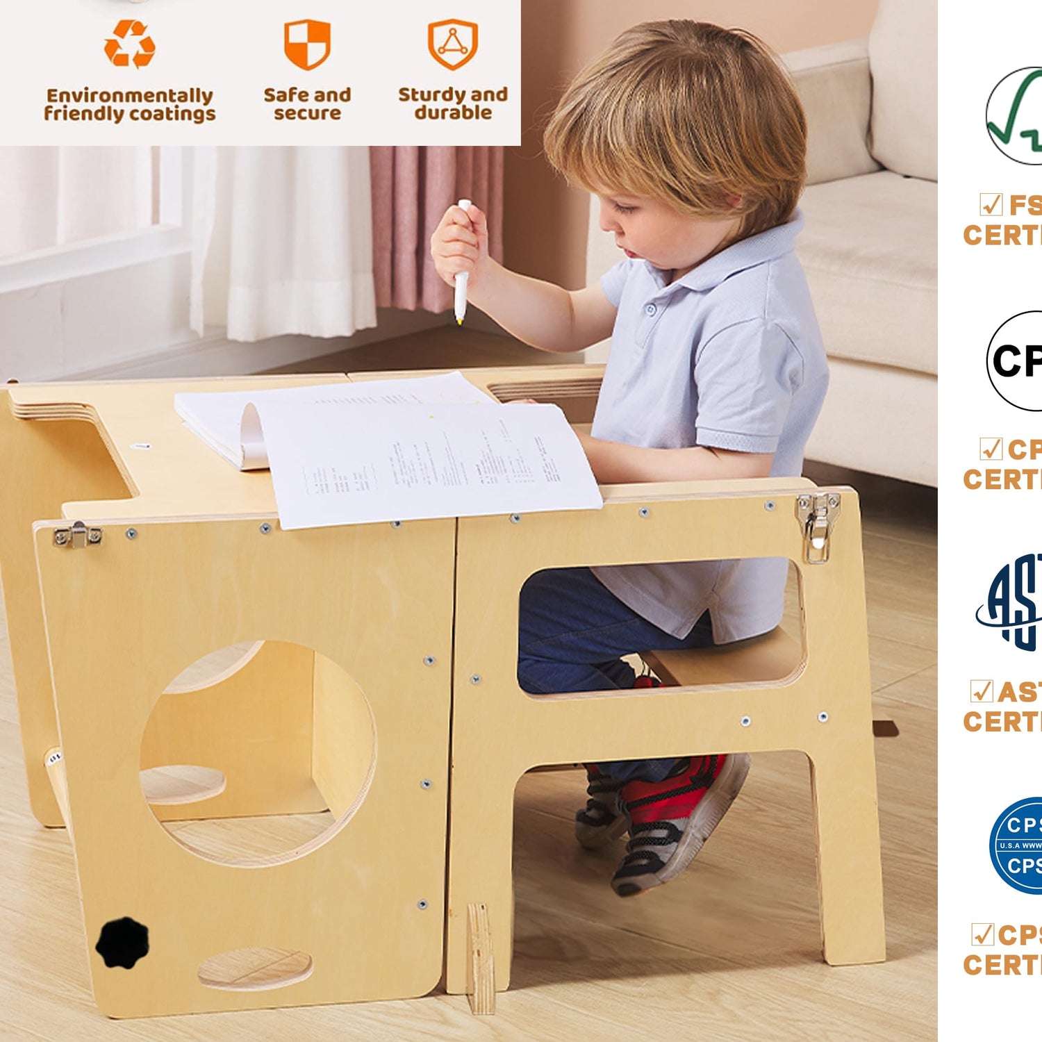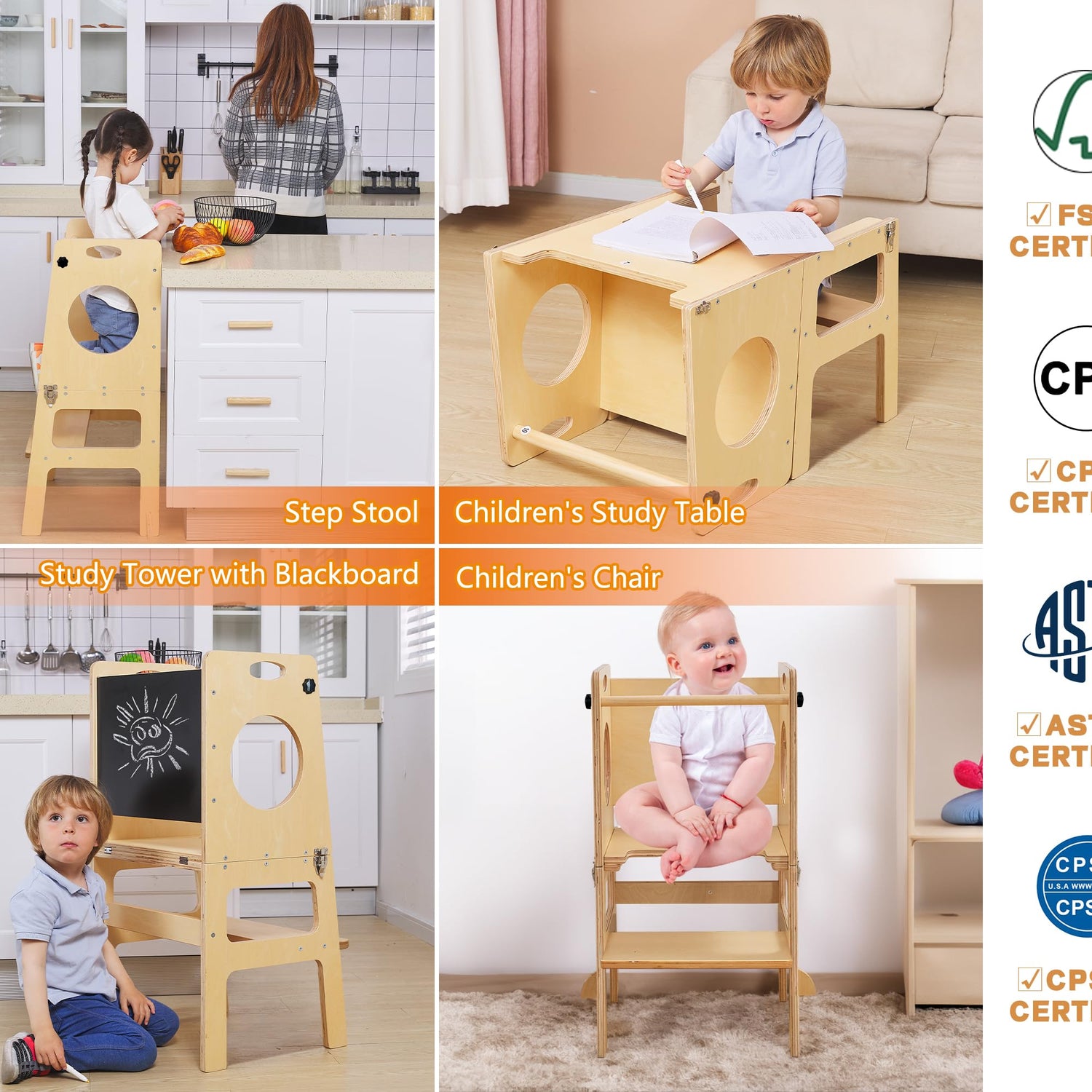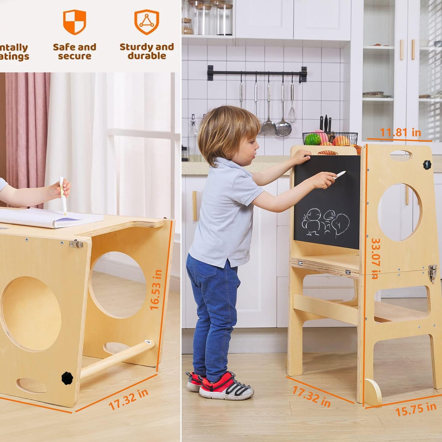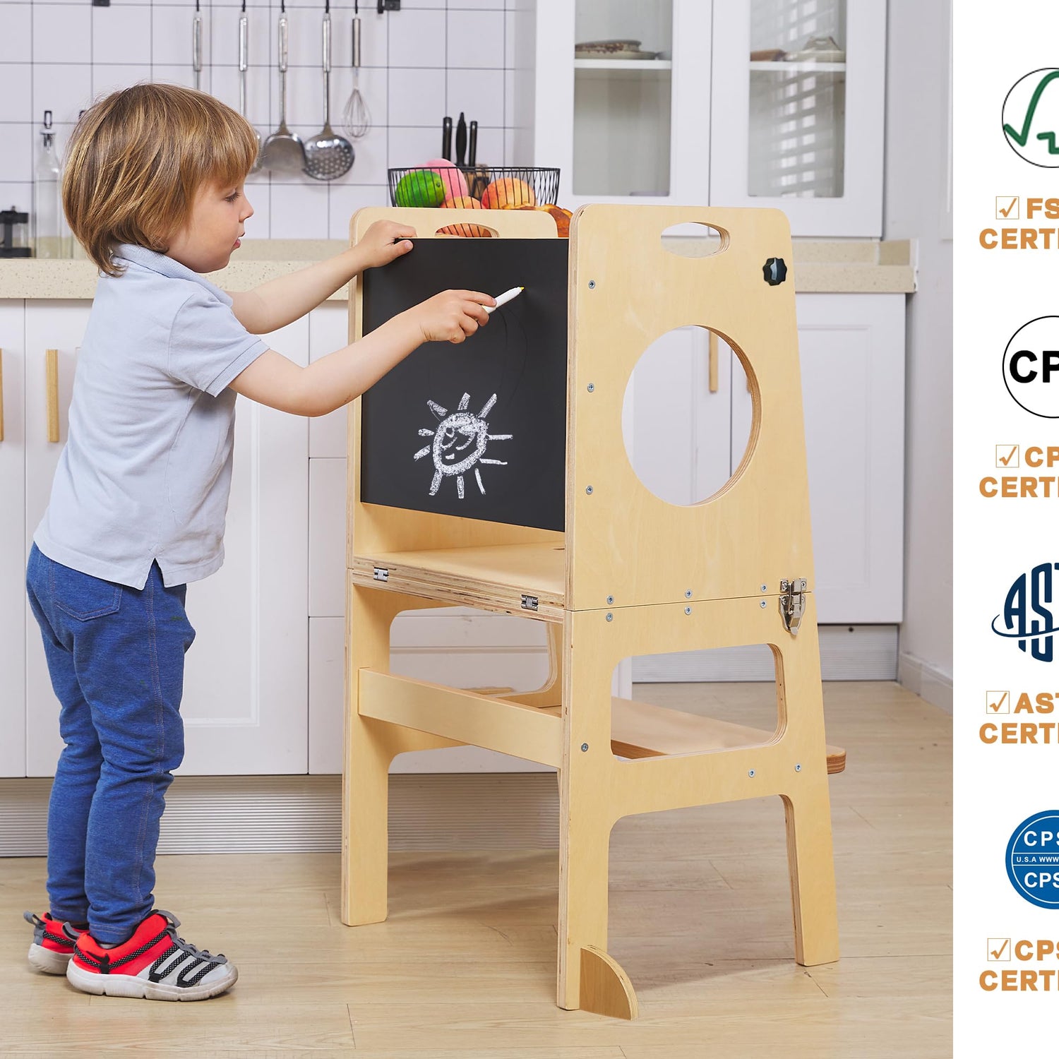 - ใ4 in 1 - Study TowerใWhen assembled, it turns into a KITCHEN STOOL HELPER step stool, a learning chalkboard for doodling, writing and drawing, and a child's chair with safety rail. By opening the latching clips and folding down the top section with one hand, this toddler kitchen stool can be turned into a little table! This is the amazing 4-in-1 Study Tower
