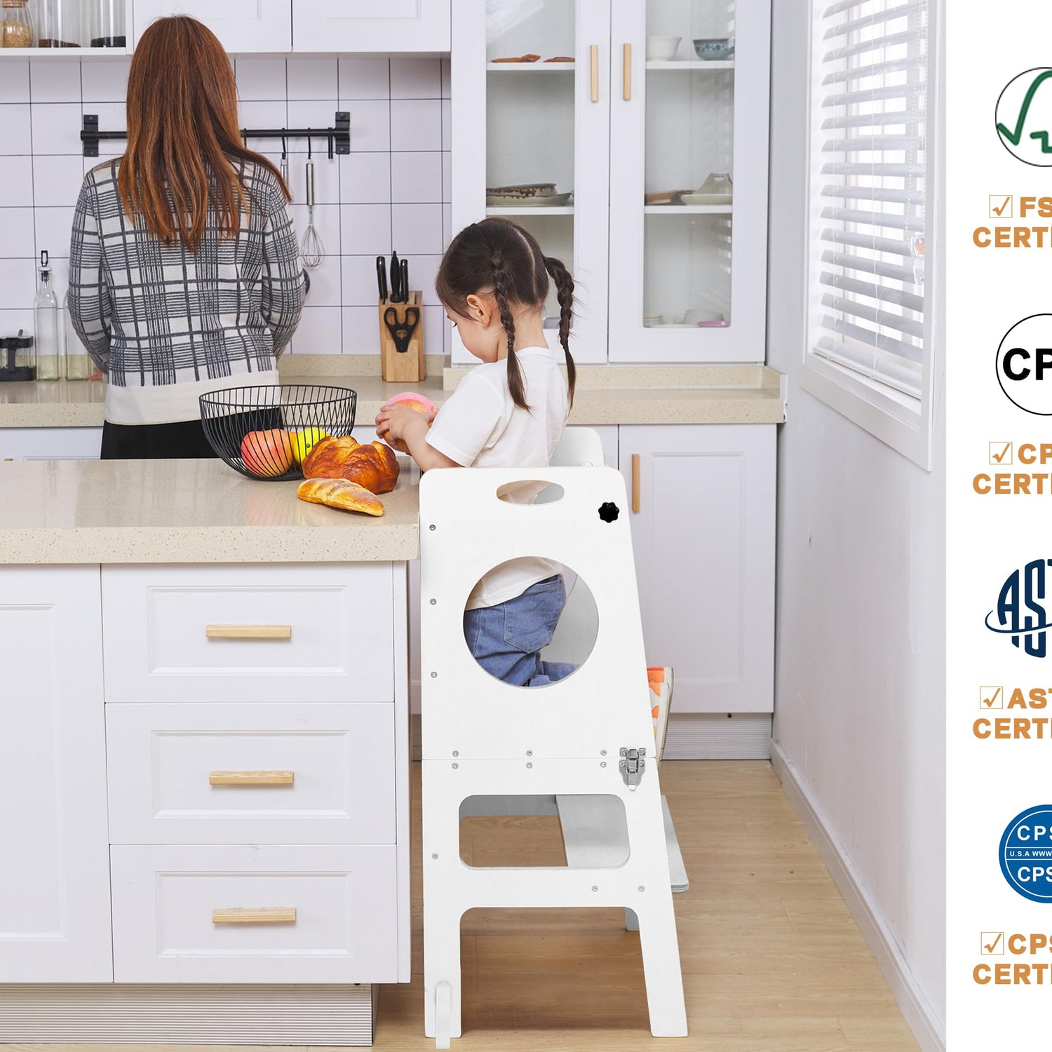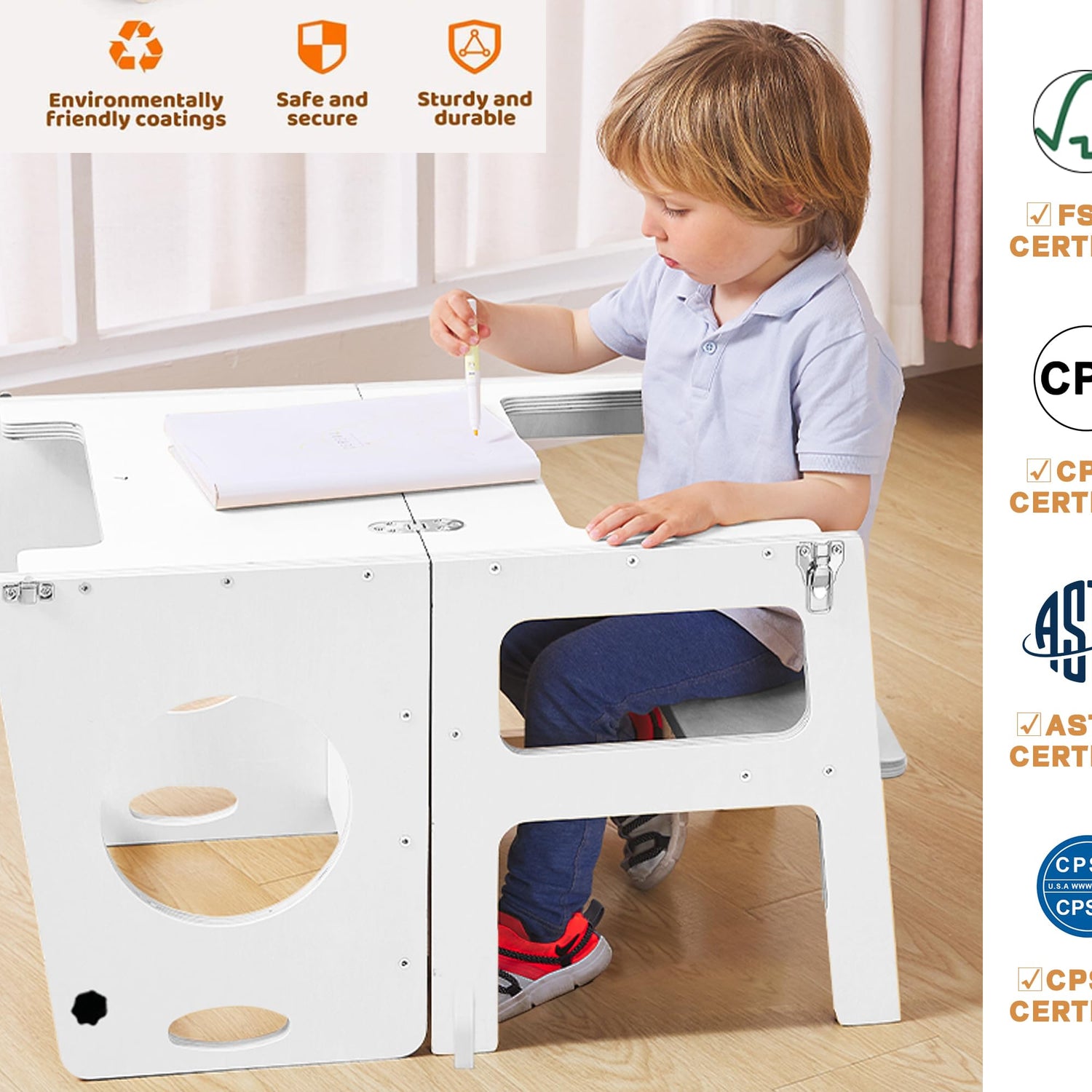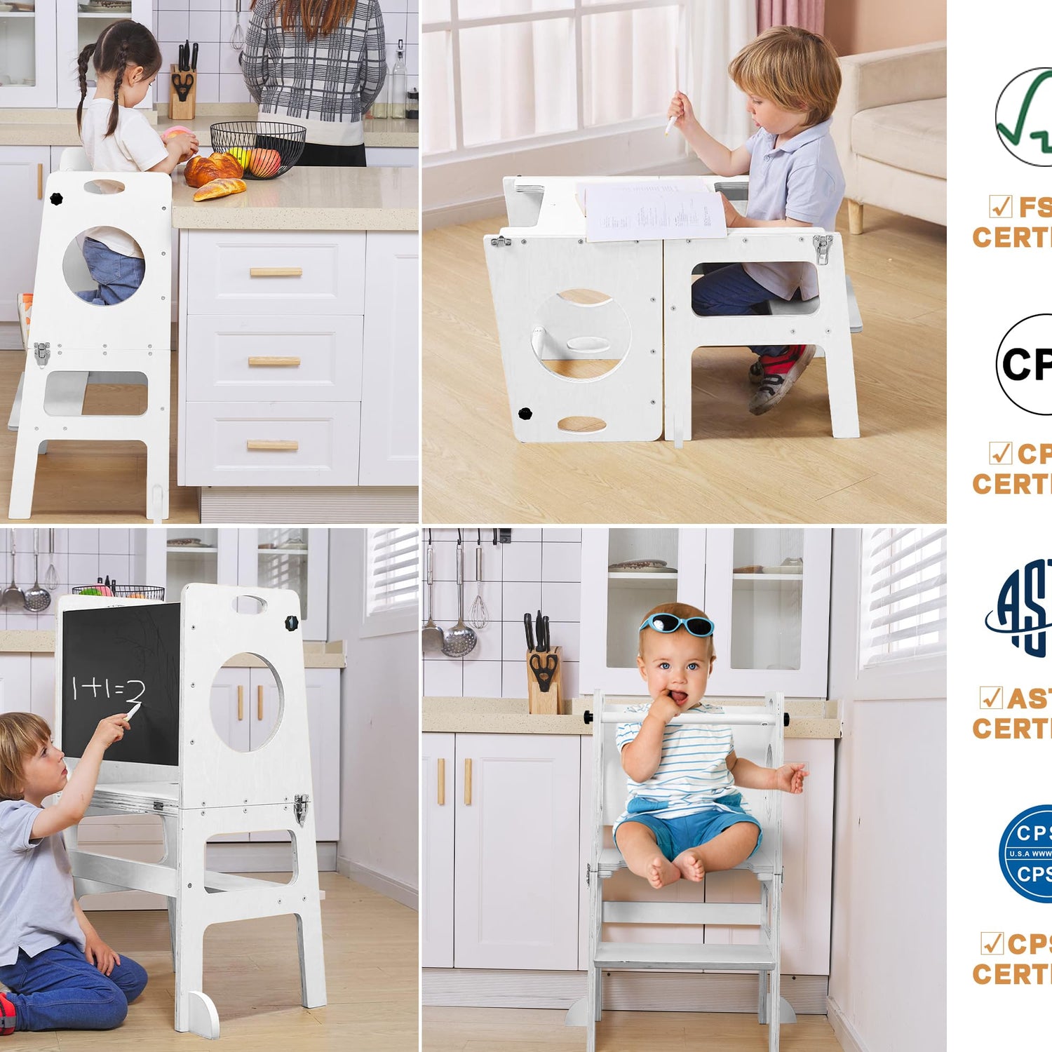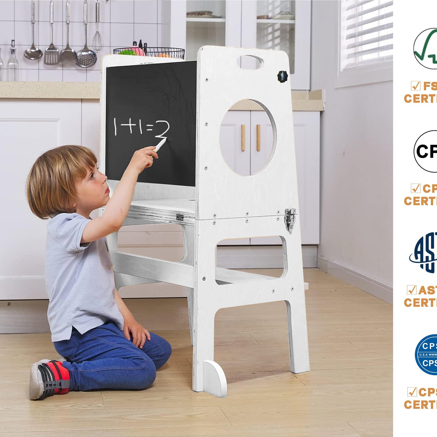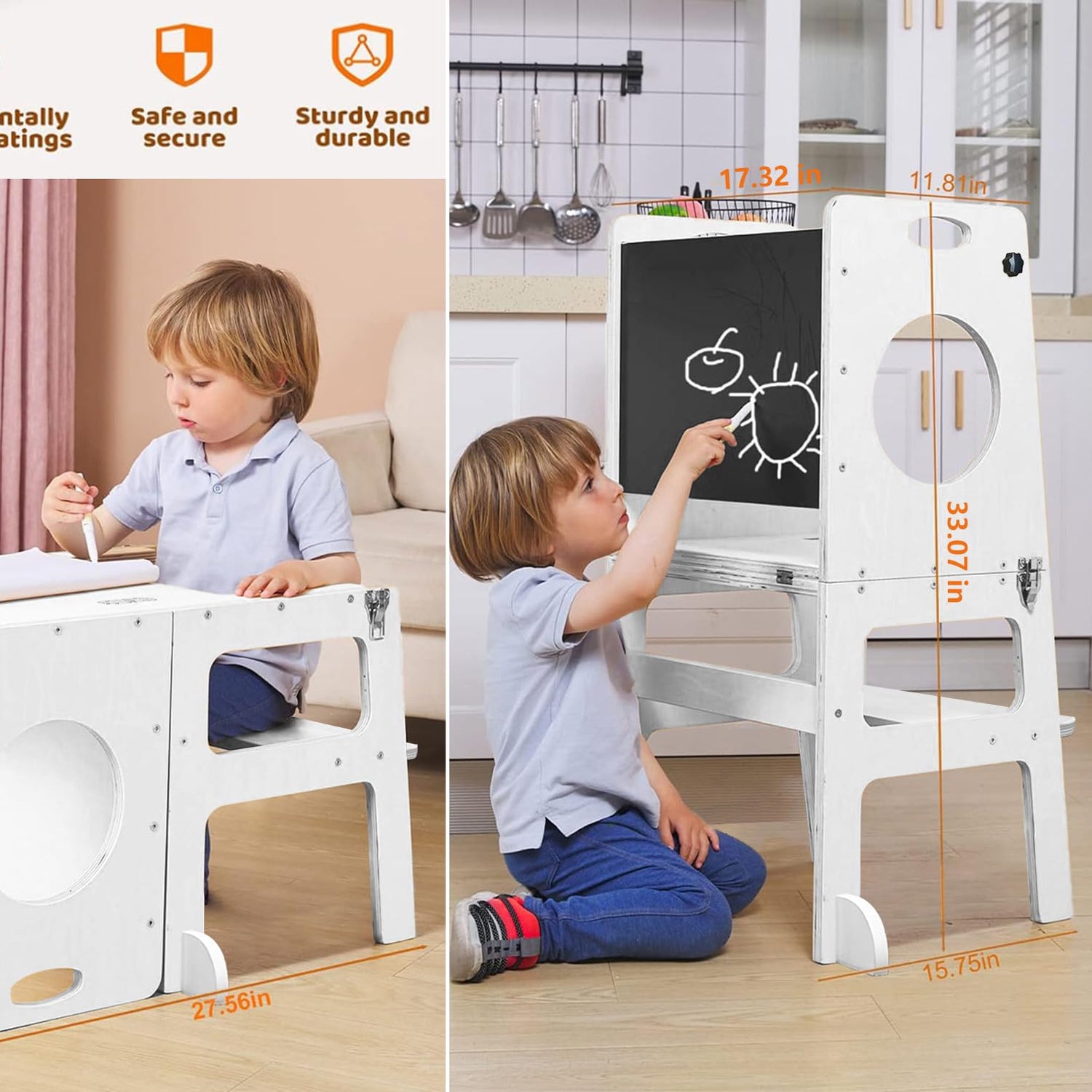 - ใ4 in 1 - Study TowerใWhen assembled, it turns into a KITCHEN STOOL HELPER step stool, a learning chalkboard for doodling, writing and drawing, and a child's chair with safety rail. By opening the latching clips and folding down the top section with one hand, this toddler kitchen stool can be turned into a little table! This is the amazing 4-in-1 Study Tower