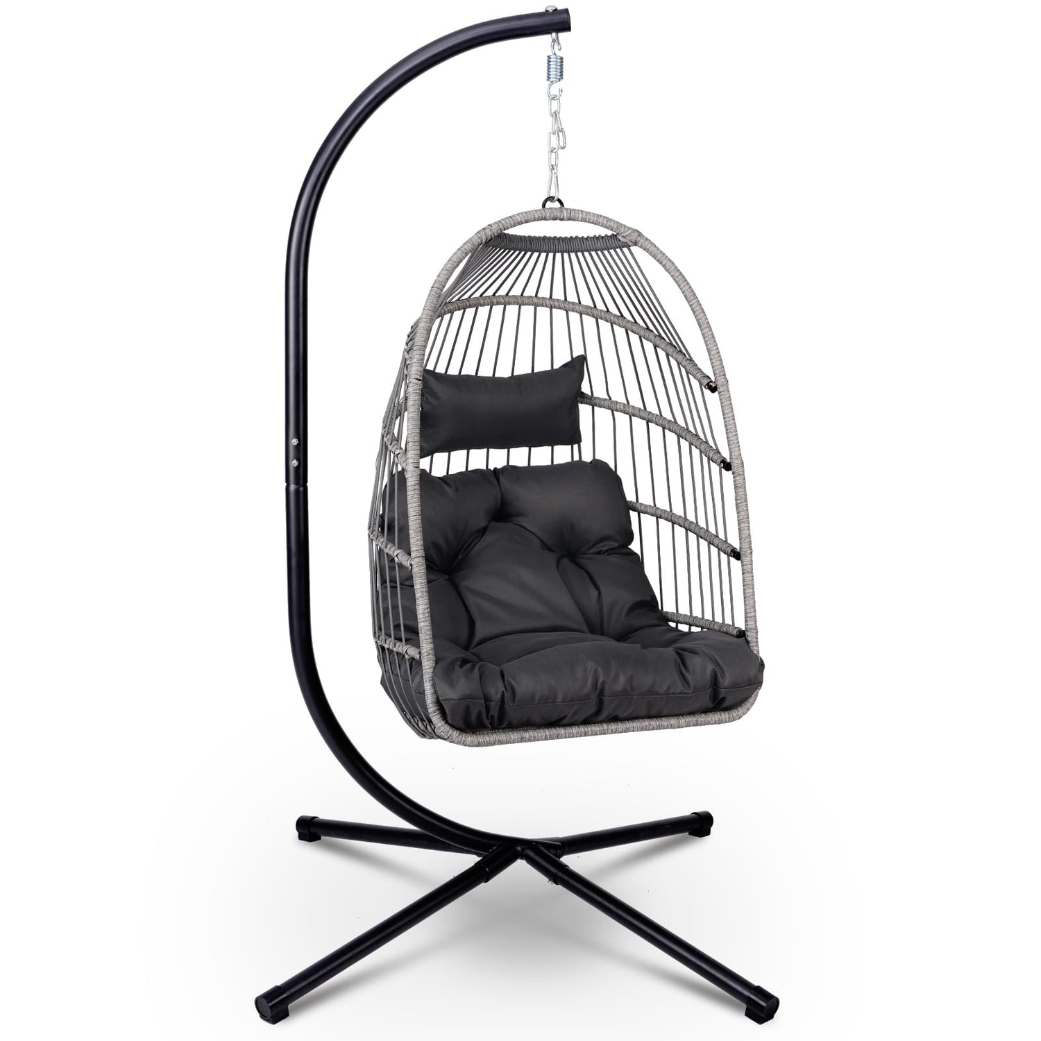 Foldable Hanging Egg Chair with Stand, HDPE Rattan and Heavy Duty Aluminum-Steel Frame, Outdoor Patio Wicker Swing Egg Chair with Headrest and Cushioned, 350 Lbs Capacity (Dark Grey)