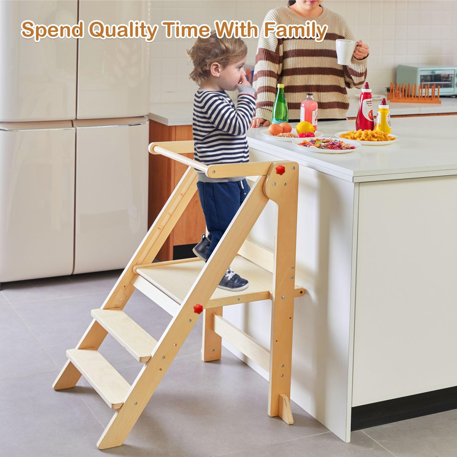 - Safety First:Our learning tower is equipped with safety railings to protect your child from falls, with side handles designed for easy grip to enhance standing stability. The base features anti-tip feet, ensuring stability even in high-risk areas like the kitchen or bathroom. Let your child explore safely while you enjoy peace of mind—every detail is crafted to safeguard your little one.