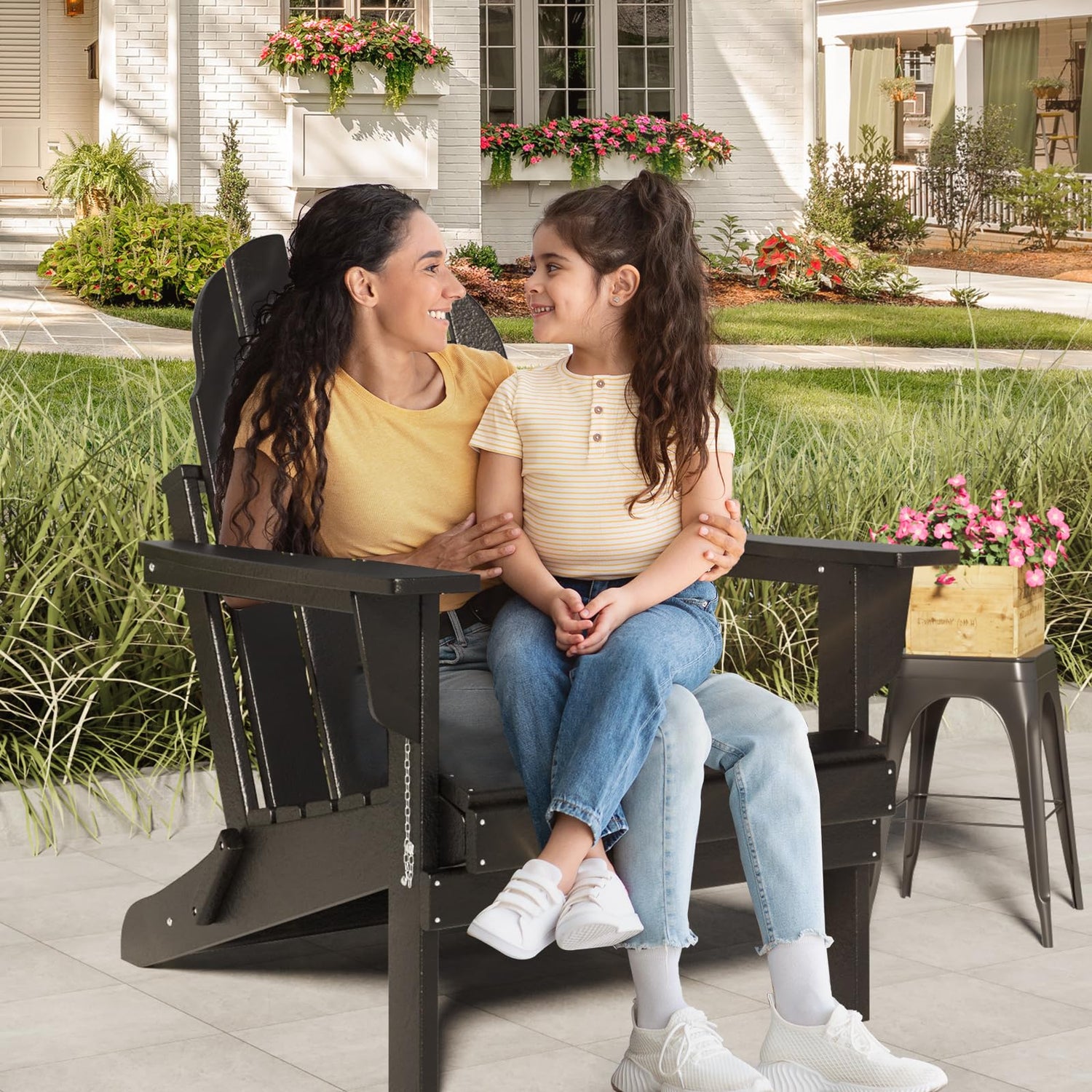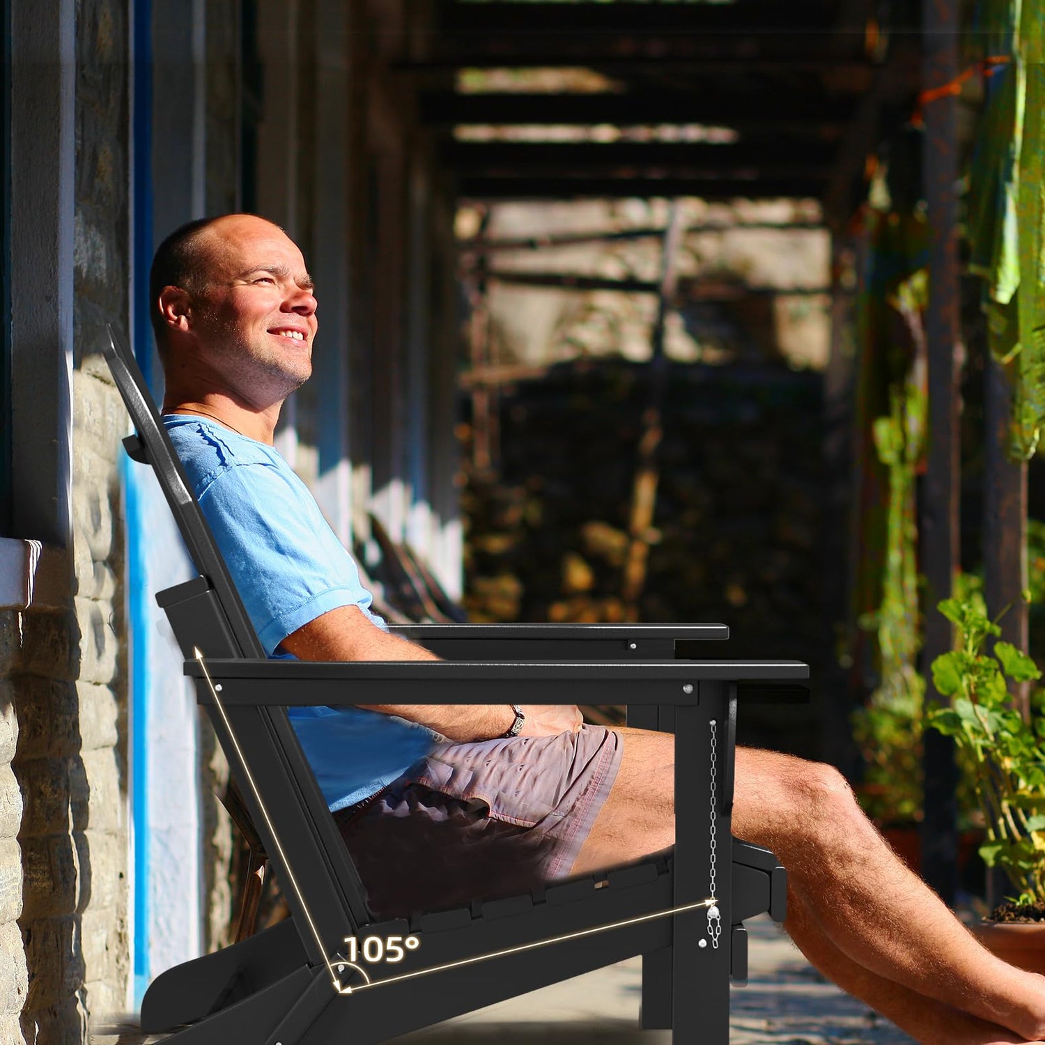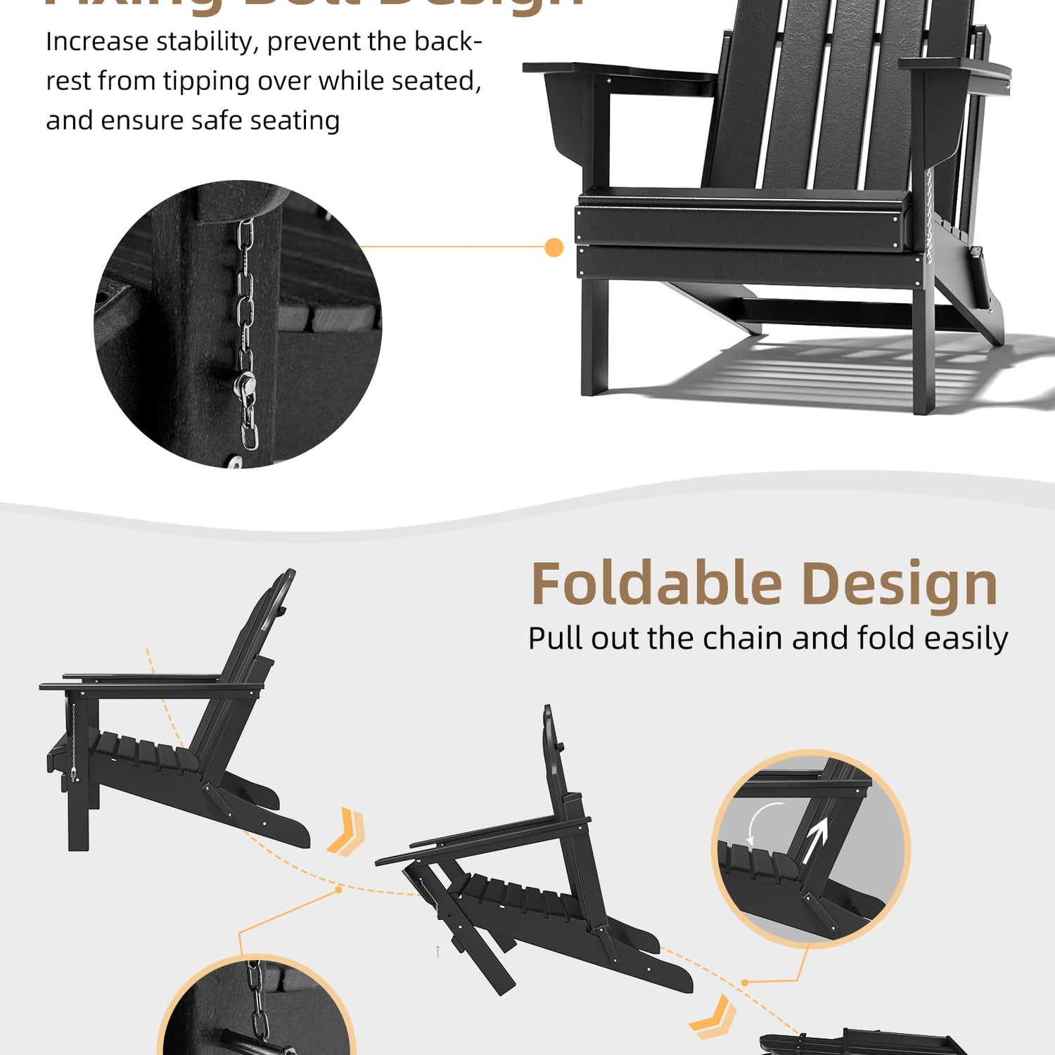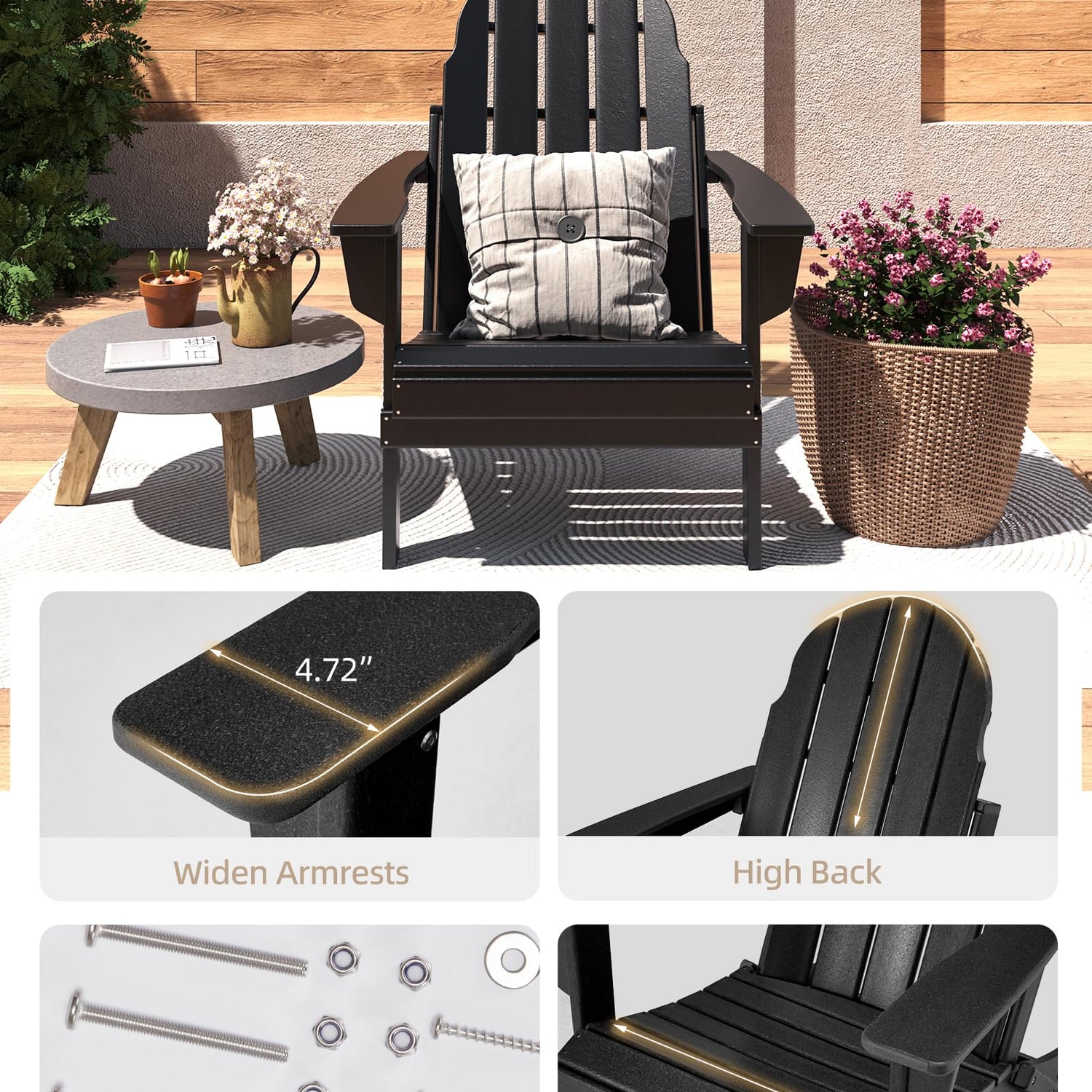 Folding Adirondack Chair - Durable HDPE Poly Lumber All-Weather Resistant, Foldable Oversized Balcony Porch Patio Outdoor Chair for Lawn, Backyard, Deck, Garden, Camping - Easy Installation, Black