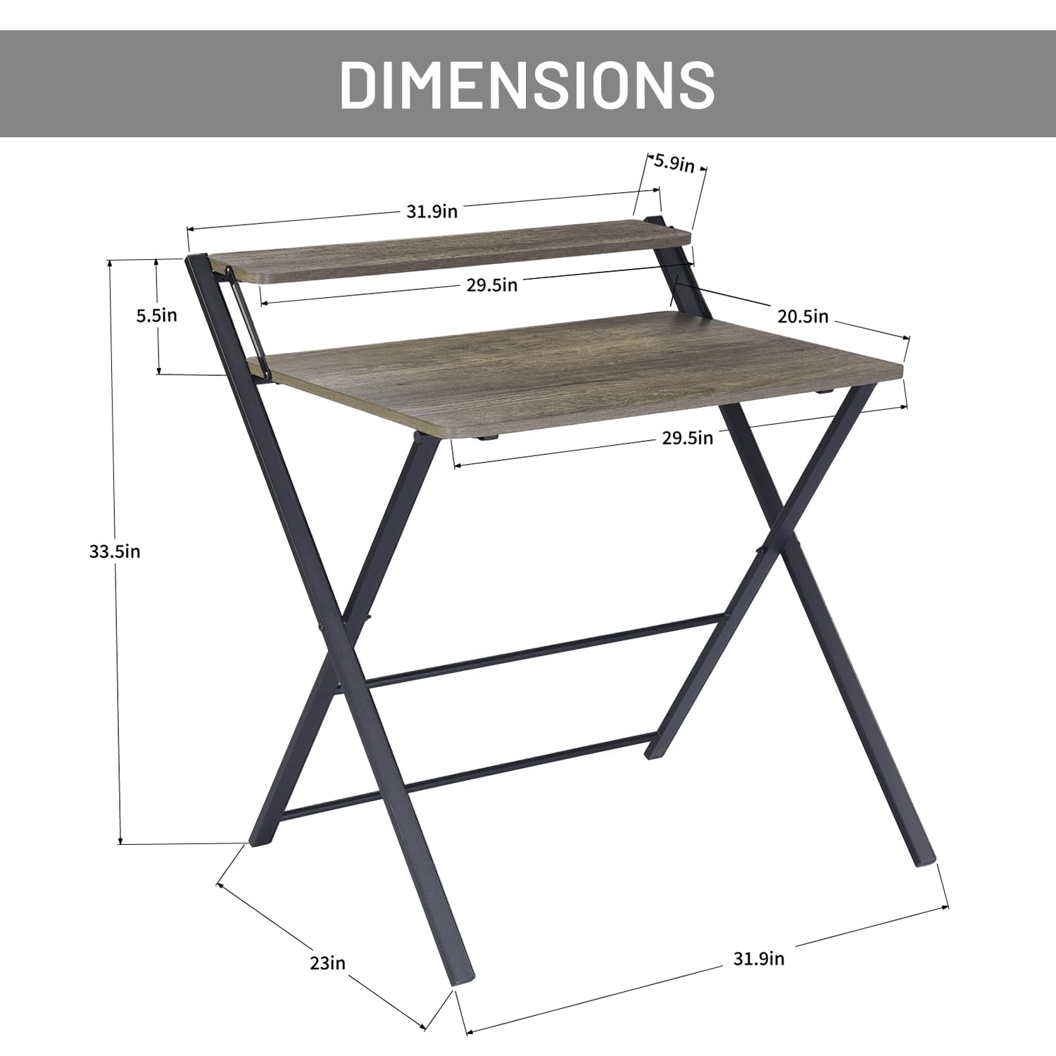 Folding Desk 2-Tier Foldable Table Space Saving Computer Table Writing Workstation for Home Office with Metal Frames/Wood Top Laptop, No Assembly Required, Rustic Brown, 31.9(L) x 20.5(D) x 33.5(H)