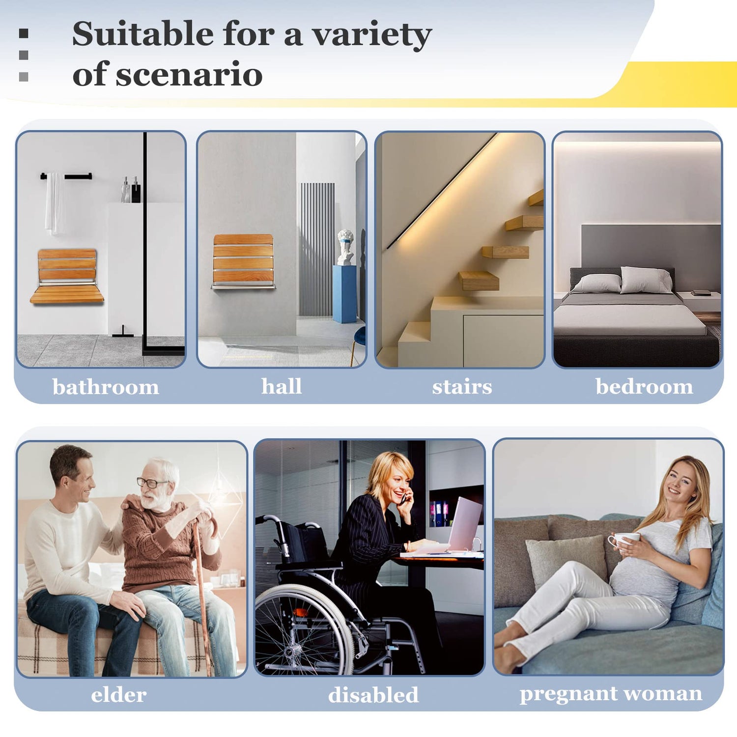 • Function: This Foldable Shower Bench can be easily installed on the wall of shower room, hospital hallway, porch, living room, balcony, dressing room, nursery room, sauna room, it is the perfect shoe stool or vanity stool. Add a stylish touch