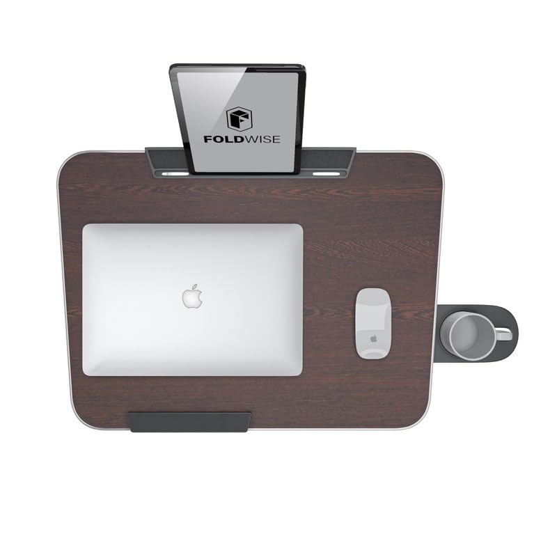 FoldWise Foldable Laptop Table - Wooden Height Adjustable Couch Table & Portable Laptop Desk with Footrest, Edge Stopper, Cupholder, Tablet Holder & Tilting Desktop