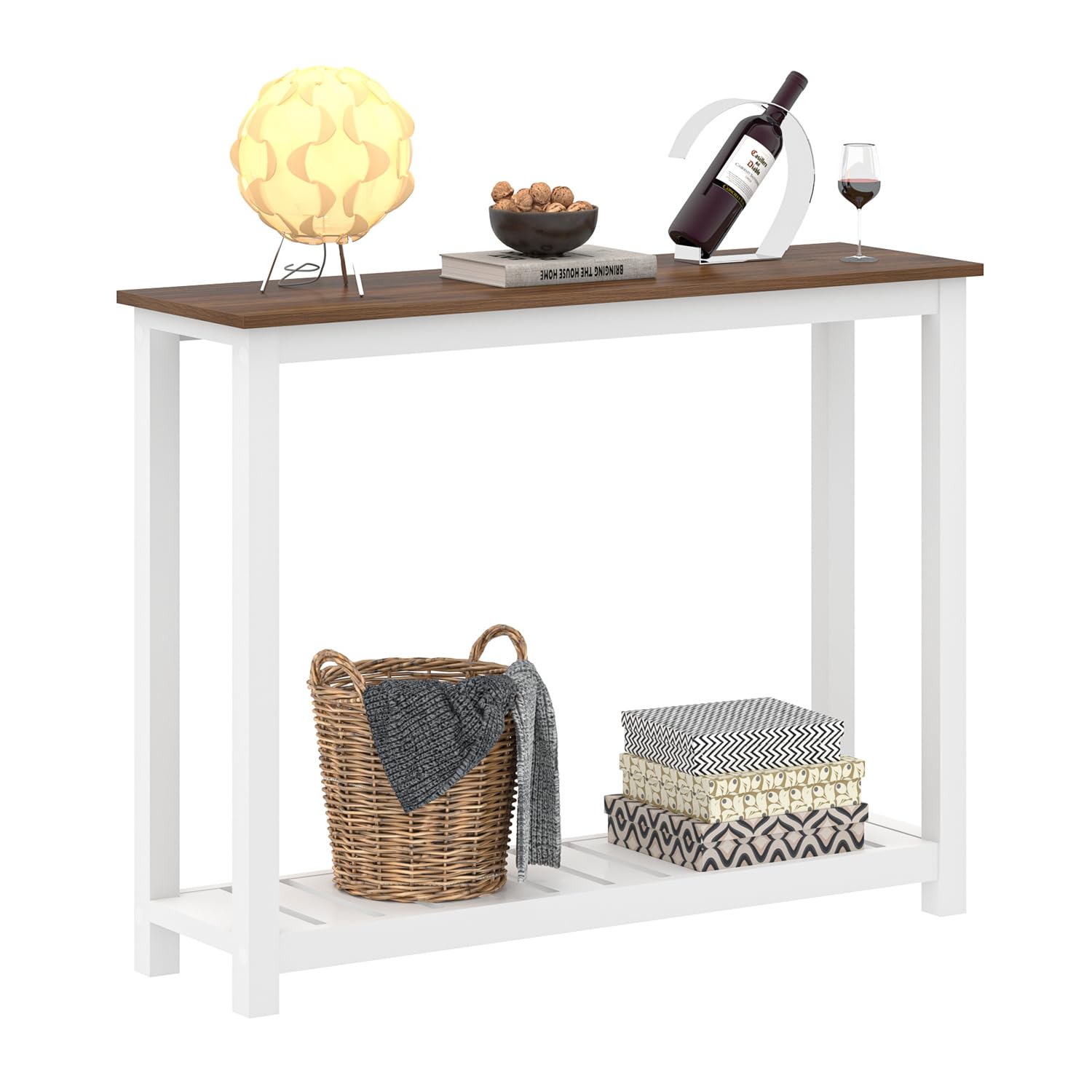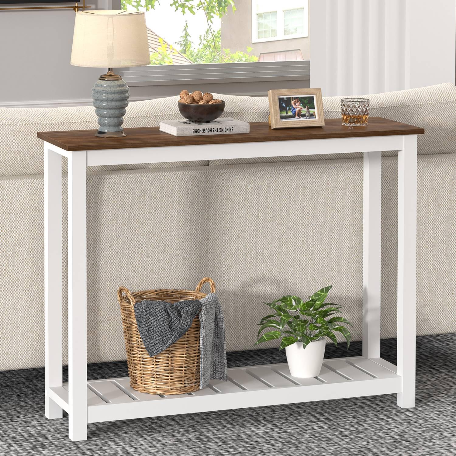 - Farmhouse Console Table: This modern entryway table features a rustic walnut wood grain surface and a sleek white frame, with a bottom slats shelf design, chic and stylish. Console tables for entryway enhance your living room and hallway with a vintage and industrial feel, making it a perfect farmhouse decor addition.