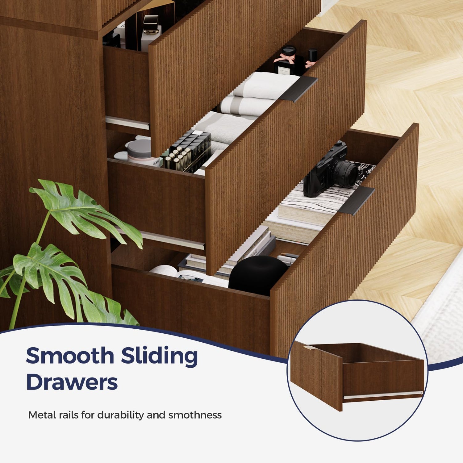FONTOI Storage Cabinet, Kitchen Pantry Storage Cabinet with 3 Drawers 2 Doors, Wood Cupboard with Adjustable Shelves & Fluted Panel Design, Tall Home Storage for Living Room, Kitchen, Walnut