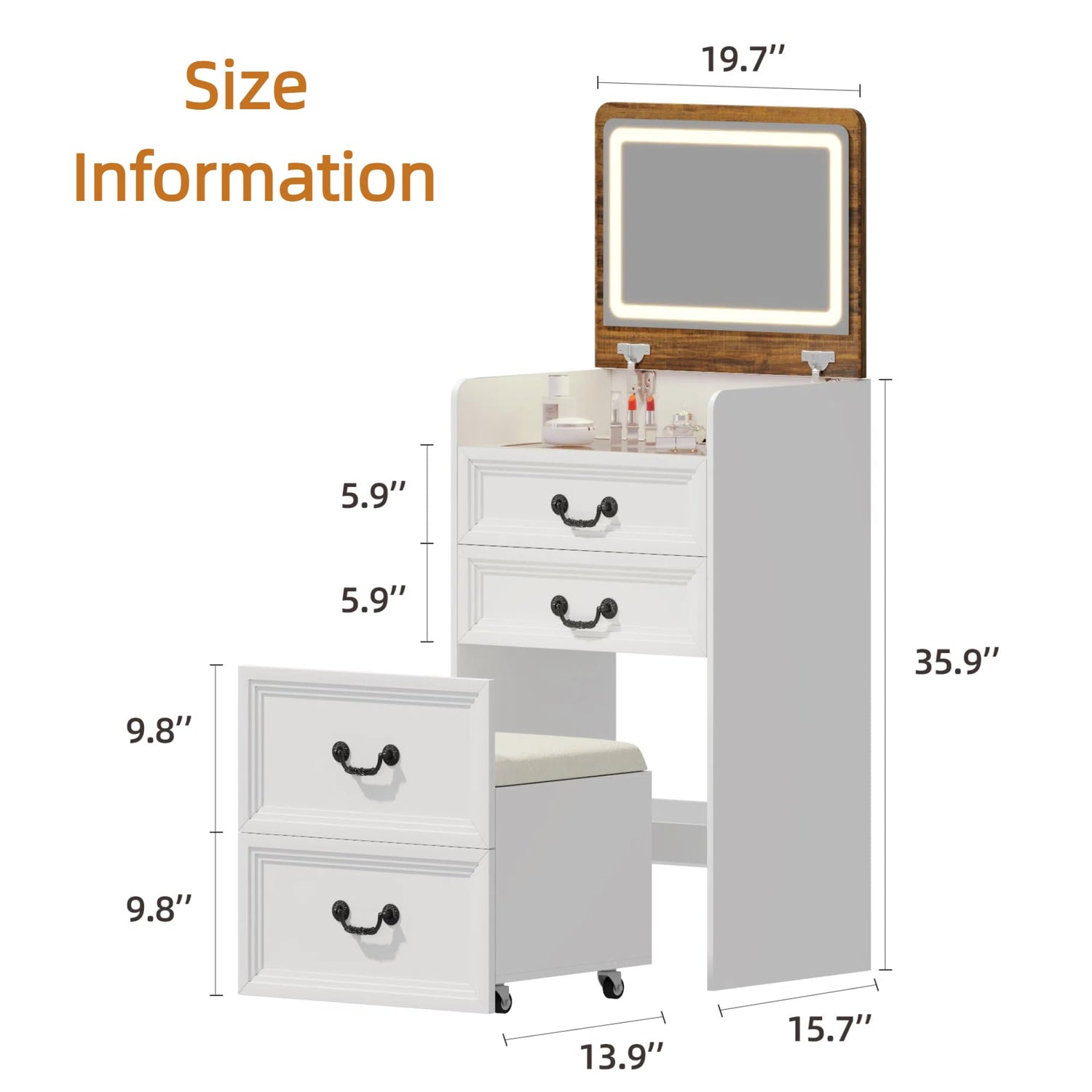 Details: FONTOI Vanity Desk, 3 in 1 Vanity Desk with Hidden Chair, Farmhouse Vanity with Mirror and Lights, Small Makeup Vanity with Charging Station Storage Shelf for Bedroom, White & Brown