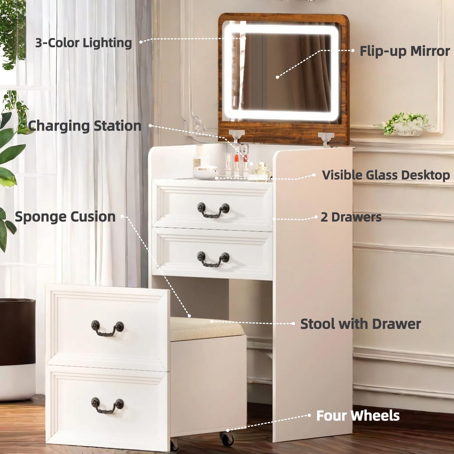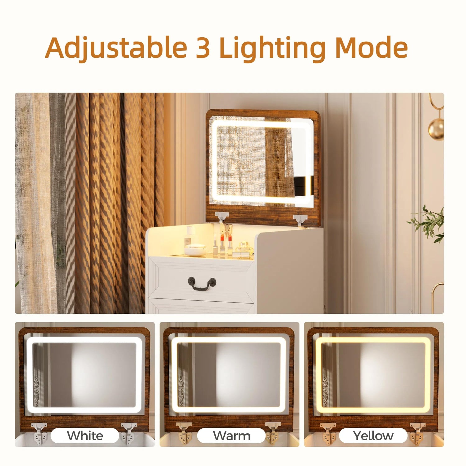 FONTOI Vanity Desk, 3 in 1 Vanity Desk with Hidden Chair, Farmhouse Vanity with Mirror and Lights, Small Makeup Vanity with Charging Station Storage Shelf for Bedroom, White & Brown